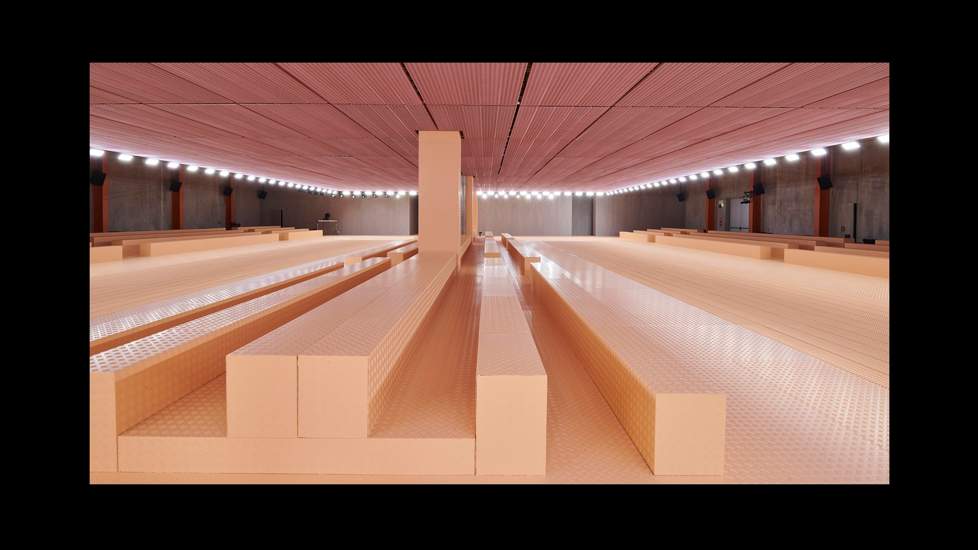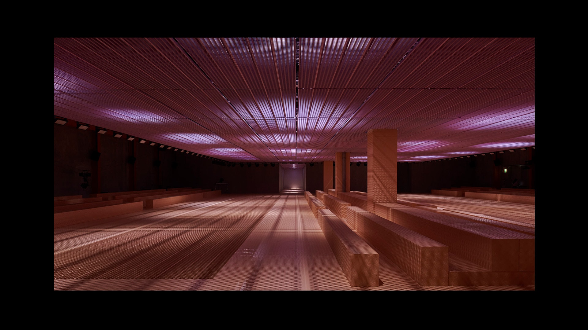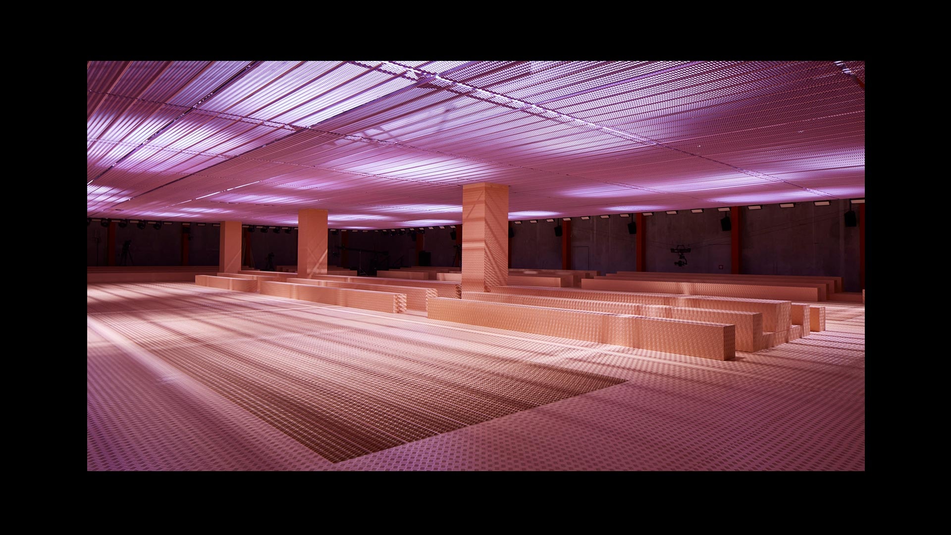 The showspace was completely clad in metal, specifically with a peach-colored floor and a pink ceiling made of perforated sheet metal for the catwalk and almond-shaped sheet metal for the walkway and guest seating.