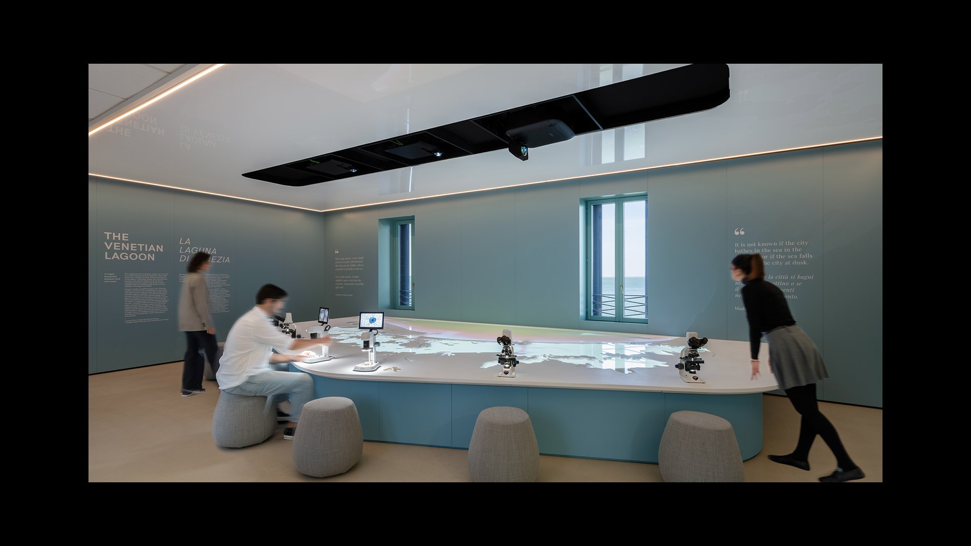 The concept is structured around three rooms that guide visitors on a journey of scale, from the very largest to the smallest sizes, from the vast expanse of the ocean to the complex biodiversity of the microorganisms in the Venetian Lagoon, ending with a focus on the human scale, examining the power of action. The Centre is equipped with personalised video projections that teach visitors to see water as a resource and a living system, while the opportunity to interact directly with marine ecosystems and scientific practices provides a hands-on learning experience.