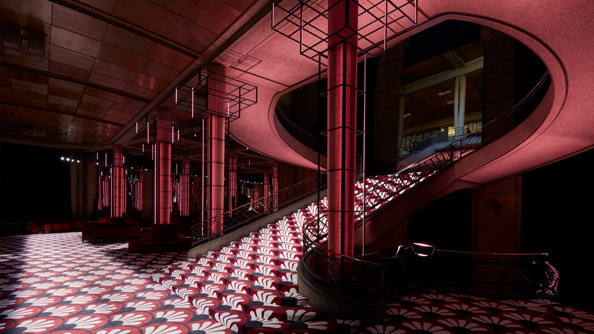 For the Fall-Winter 2020 Miu Miu show, AMO confronts August Perret’s sober Palais d’Iena with a newfound sense of audacity, hijacking the surfaces of the architecture with new patterns, colors, and textures.