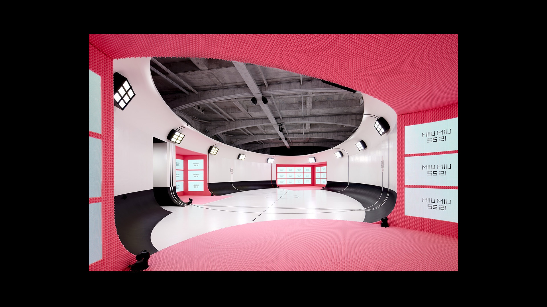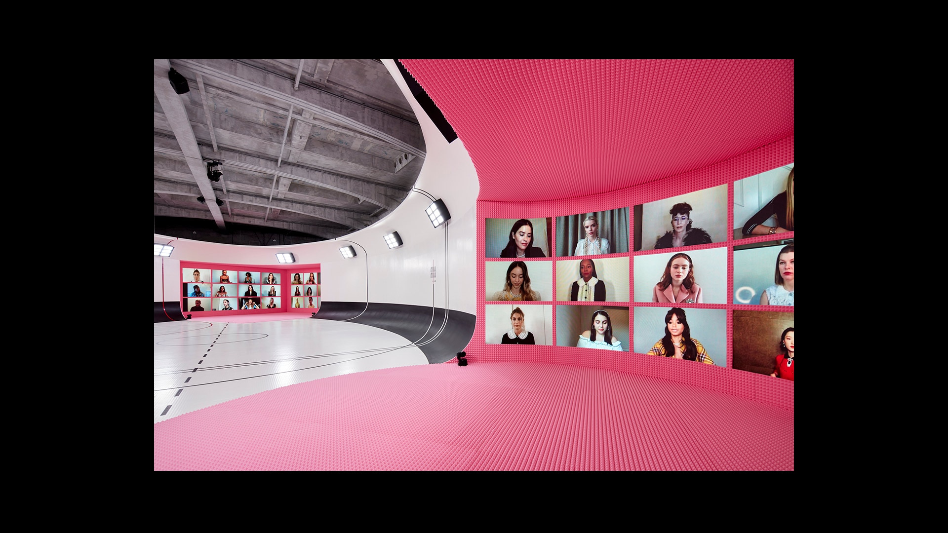 Milan, 6 October 2020 - The stage for the Miu Miu show is an ampitheater - a ‘sports palace’ re-imagined by AMO, dubbed the Miu Miu Club and experienced digitally by a specially-invited audience. Bright pink acoustic foam cossets phalanxes of video-screens displaying communities of Miu Miu women, gathered around the world. As with sport, fashion requires spectators - not the passive and unseen, but the active and interactive. They are performative phenomena, where an audience is necessary. Broadcast to the auditorium, the audience’s reactions create an unescapable rendezvous with the models.