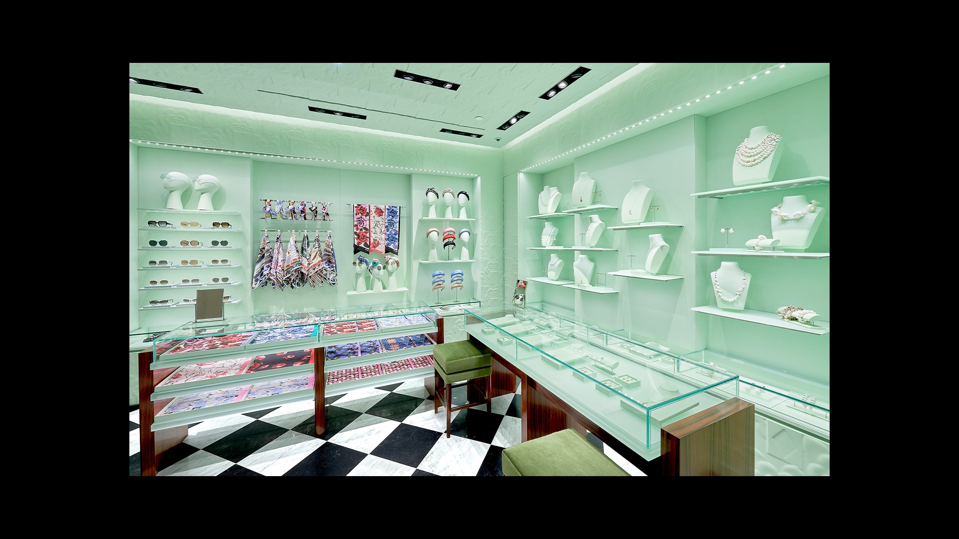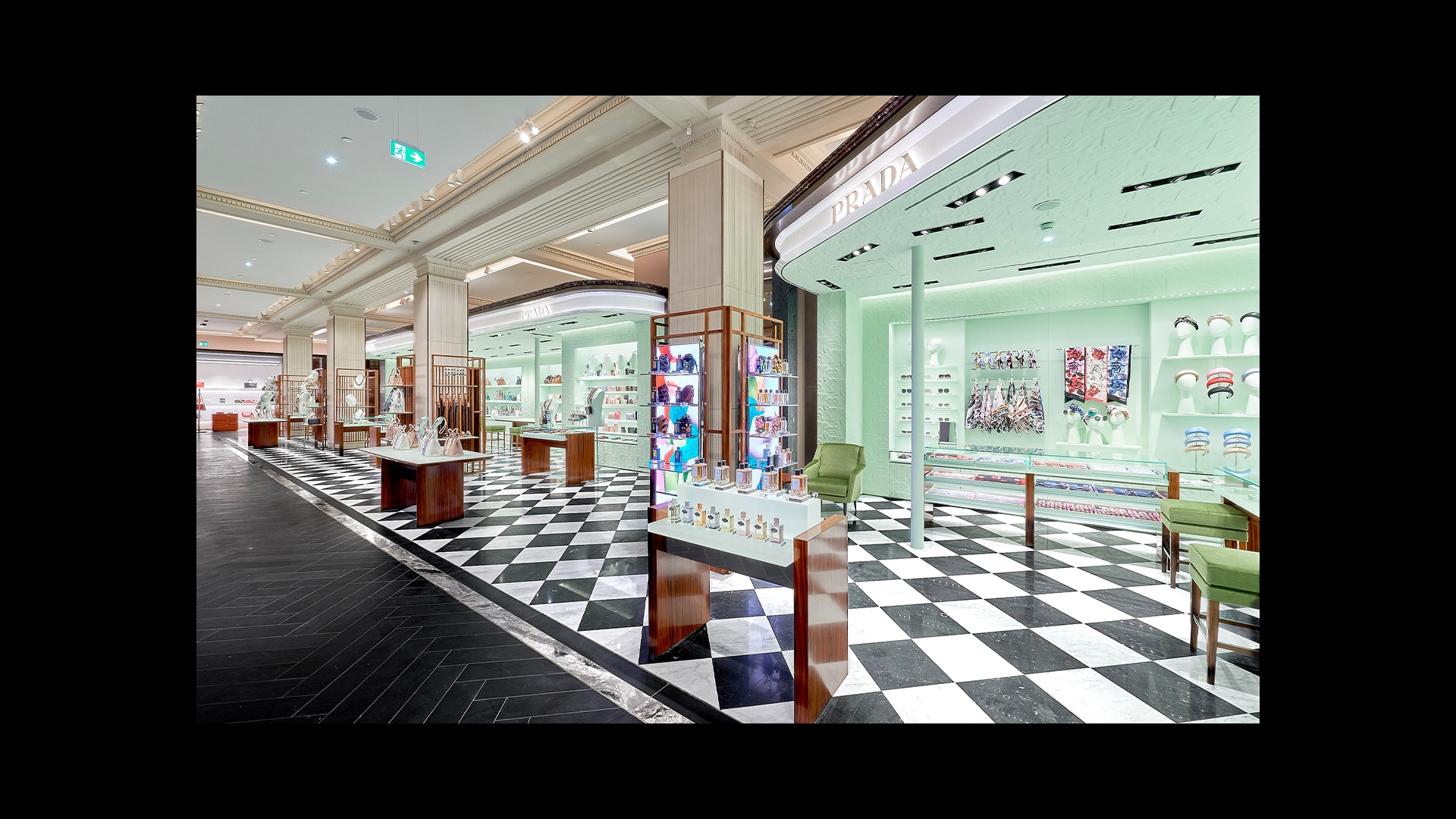 Milan, 21 August 2020 - Prada revamps its boutique at the prestigious Harrods department store in London. The space of 160 square metres is characterized by original wooden screens wrapped around the existing columns of the department store are used as displays and differentiated for specific products and new tables in wood and perspex designed expressly for this space, seeing classic and modern materials placed side by side in a new reading of Prada’s sophisticated style. The 1950s style chairs, upholstered in green velvet fabric, the black and white chequered floor and an intimate, feminine area in a special corner which showcases an exclusive selection of gold jewels, silk scarves, headbands and eyeglasses complete the furnishings.