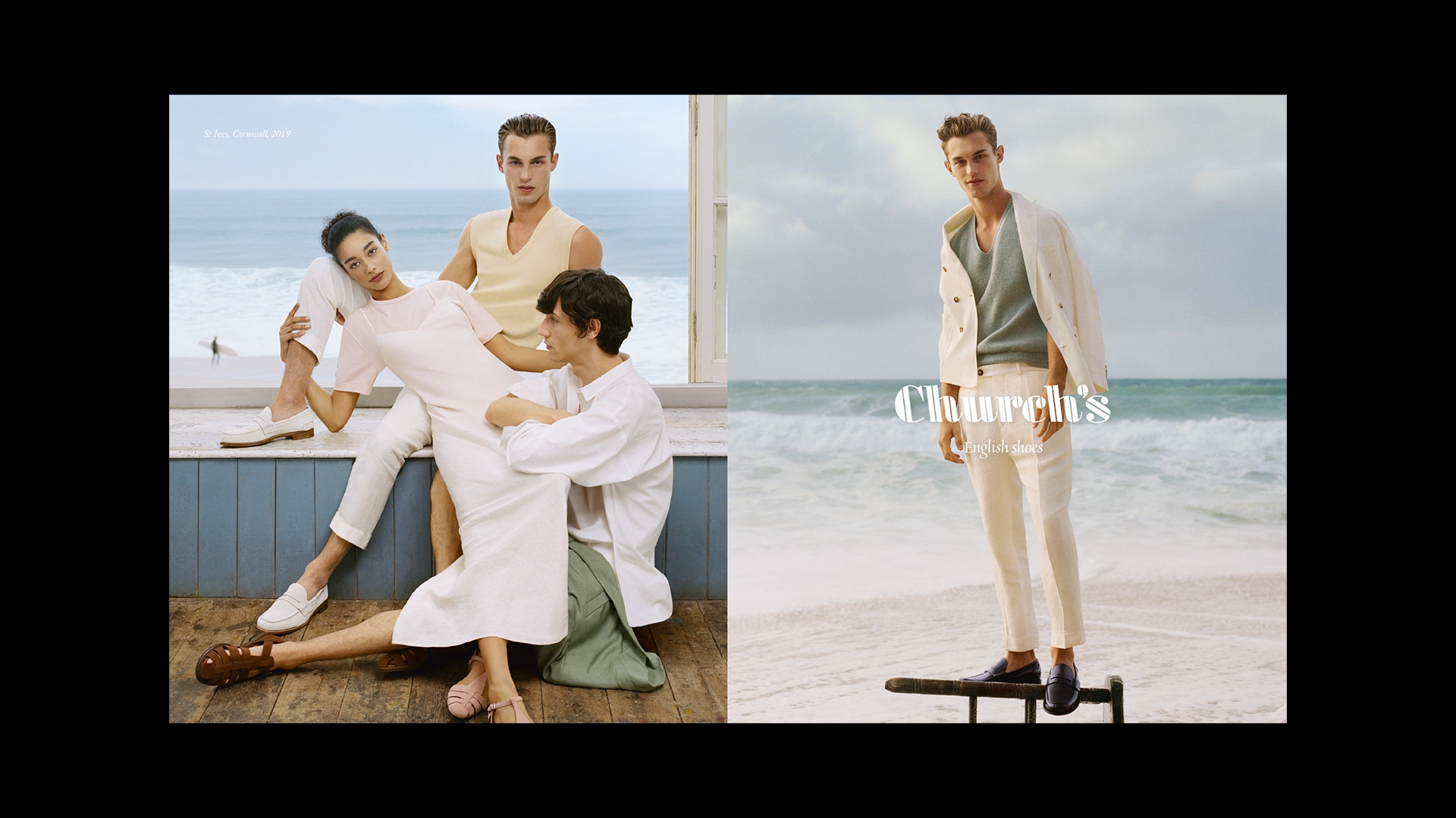An almost imperceptible meeting of sea and sky and long stretches of white sand provide the backdrop to the advertising campaign for Church’s Spring/Summer 2020 collection, set in the English town of St. Ives. Romantic shots with a hint of irony convey the spirit and nature of the surroundings and beaches and offer glimpses of this part of Cornwall, recounting the joyful and carefree summer of three young people from a window overlooking the ocean. Brett Lloyd’s images present soft and natural colours, like the sand, smoothed by the waves, and the blue of the ocean that stretches beyond the cliffs, in a boundless place where time seems to stand still, and where everything feels vaguely surreal.