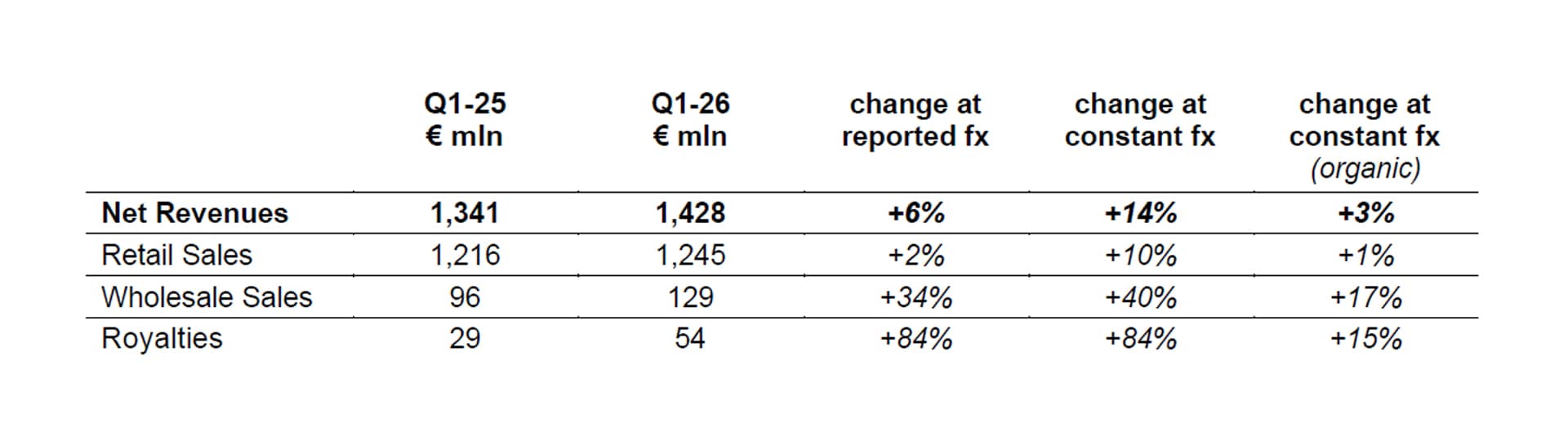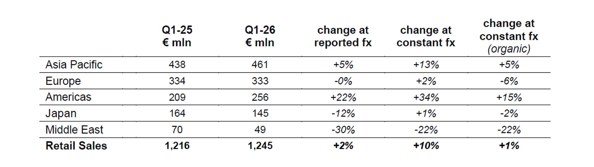 Prada reported a resilient performance at +0.4%, in line with Q4-25, supported by further improvements in the Americas and Asia Pacific, notably Mainland China, Hong Kong and Macau among others. The performance was underpinned by full price sales, with steady, progressive improvement in the past quarters, including in Q1-26, despite the negative impact of Middle East; the positive performance in full price was partially offset by the continued reduction of outlet contribution. The product offering remained balanced, sustained by a dynamic Leather Goods offer across the price architecture and the launch of a new Prada Re‑Nylon for SEA BEYOND capsule.