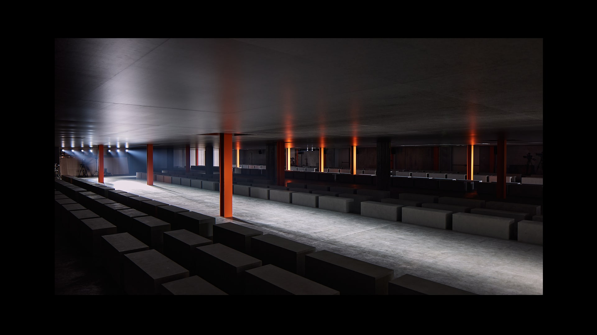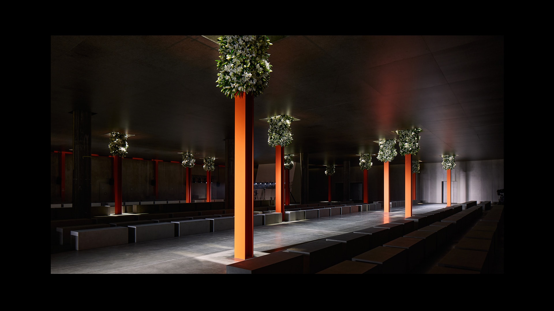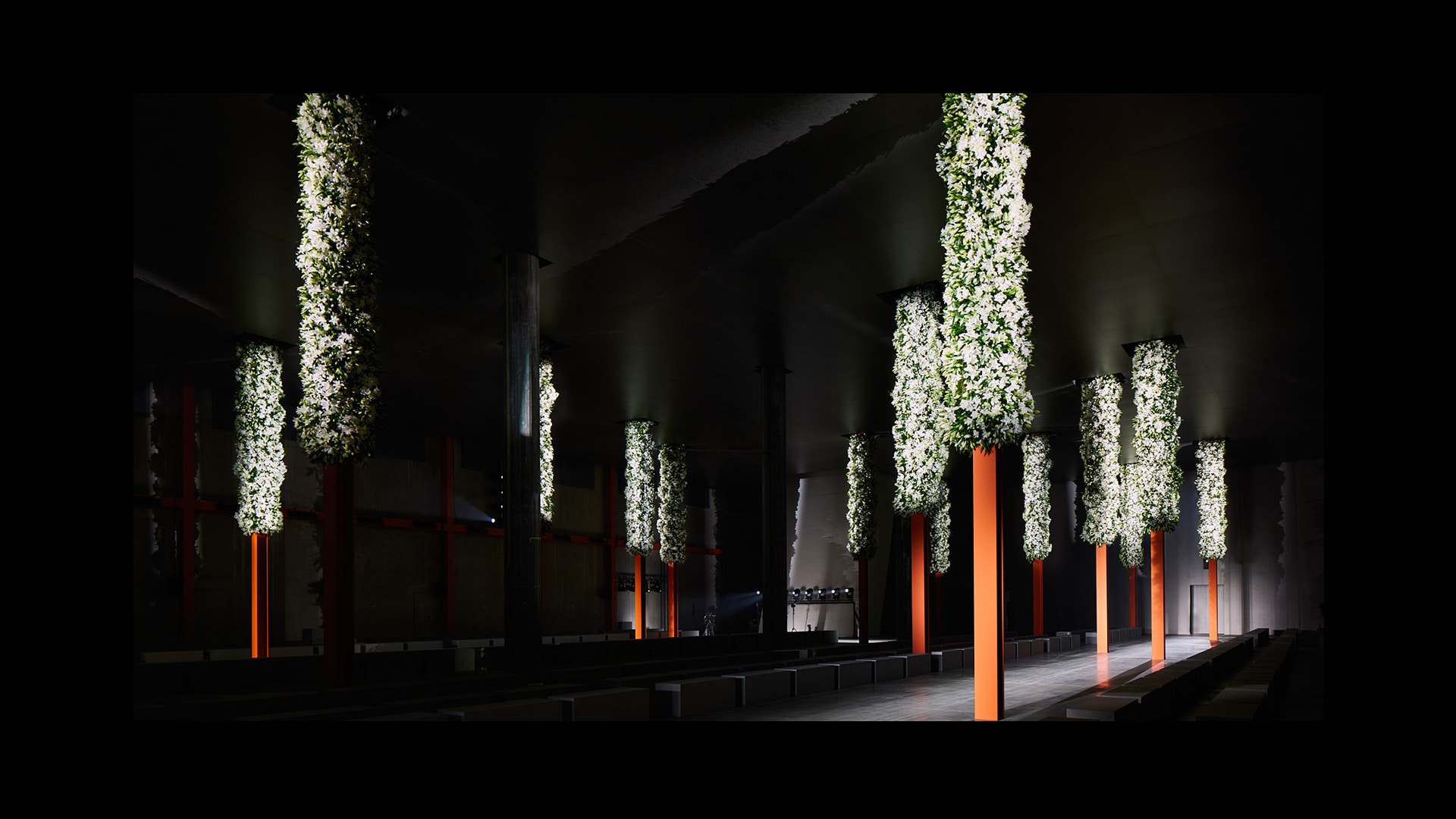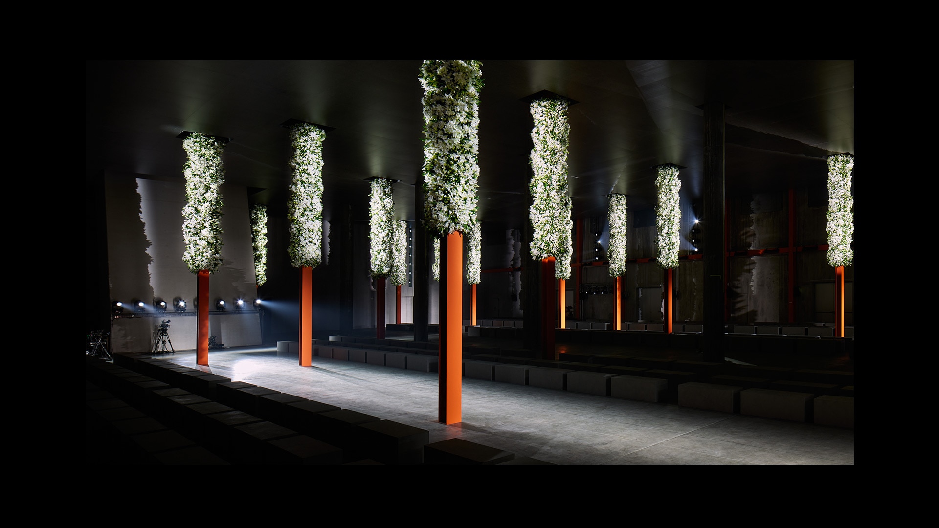 Il concetto di trasformazione si estende al Deposito della Fondazione Prada, dove un soffitto mobile – che riprende l’allestimento della sfilata uomo di gennaio – ridisegna gli ambienti, allargandoli e restringendoli, e svela decorazioni floreali prima nascoste dagli elementi industriali, inducendo il pubblico a riconsiderare da un nuovo punto di vista lo spazio e le figure che si muovono al suo interno.