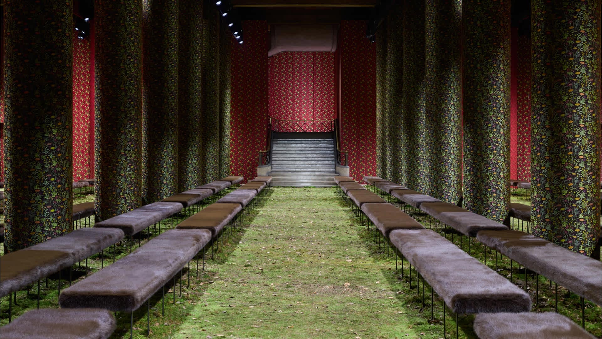 All’interno del Palais d’Iéna prende forma una foresta selvaggia racchiusa in un palazzo: due paesaggi simbolo di grandezza, immensità. Figure in movimento, non corpi che attraversano uno spazio passivo, una contrapposizione: contesto attivo e cornice. Come gli abiti, anche la scenografia ne mette in risalto l’individualità - la loro presenza, le loro menti.