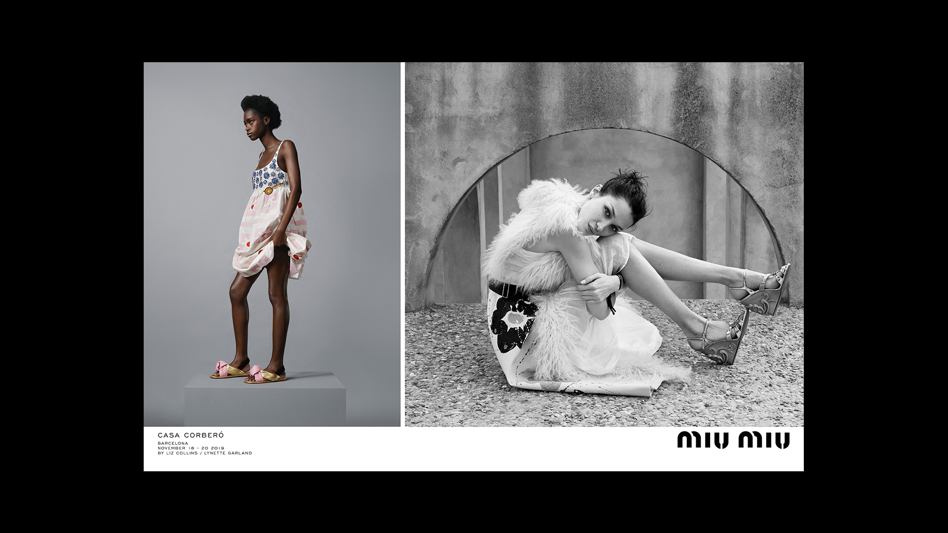 Una colonia tutta al femminile le cui storie si svolgono all’interno di uno spazio tentacolare, labirintico: “Casa Corberó”, la “casa sublim” dell’artista catalano Xavier Corberó a Esplugues, - nelle vicinanze di Barcellona - è teatro della campagna Miu Miu Primavera Estate 2020. Parte scenografia, parte installazione, parte galleria, parte dimora. Le immagini fisse e in movimento, il bianco e nero e i colori vibranti, vengono contrapposti e messi a confronto, come anche l’idea stessa di soggetto e oggetto. Queste caratteristiche si riflettono nella collezione stessa, dove la creatività si esprime liberamente con chiazze di colore pitturate a mano, bottoni “sbagliati”, applicazioni di rouches, in contrapposizione alle forme disciplinate e le silhouette severe.