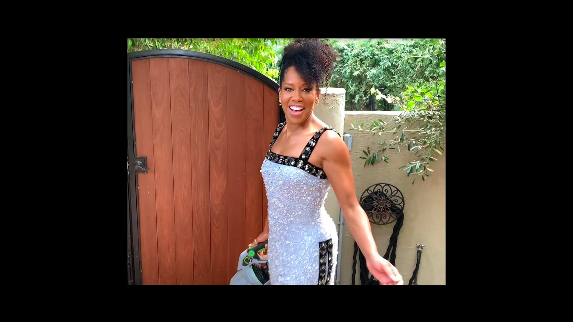 Regina King, con un abito vintage di Prada in georgette di seta azzurro polvere, impreziosito all over da ricami di cristalli trasparenti e paillettes e decorazioni di paillettes nere. Indossato da Regina al Vanity Fair Oscar Party 2020.