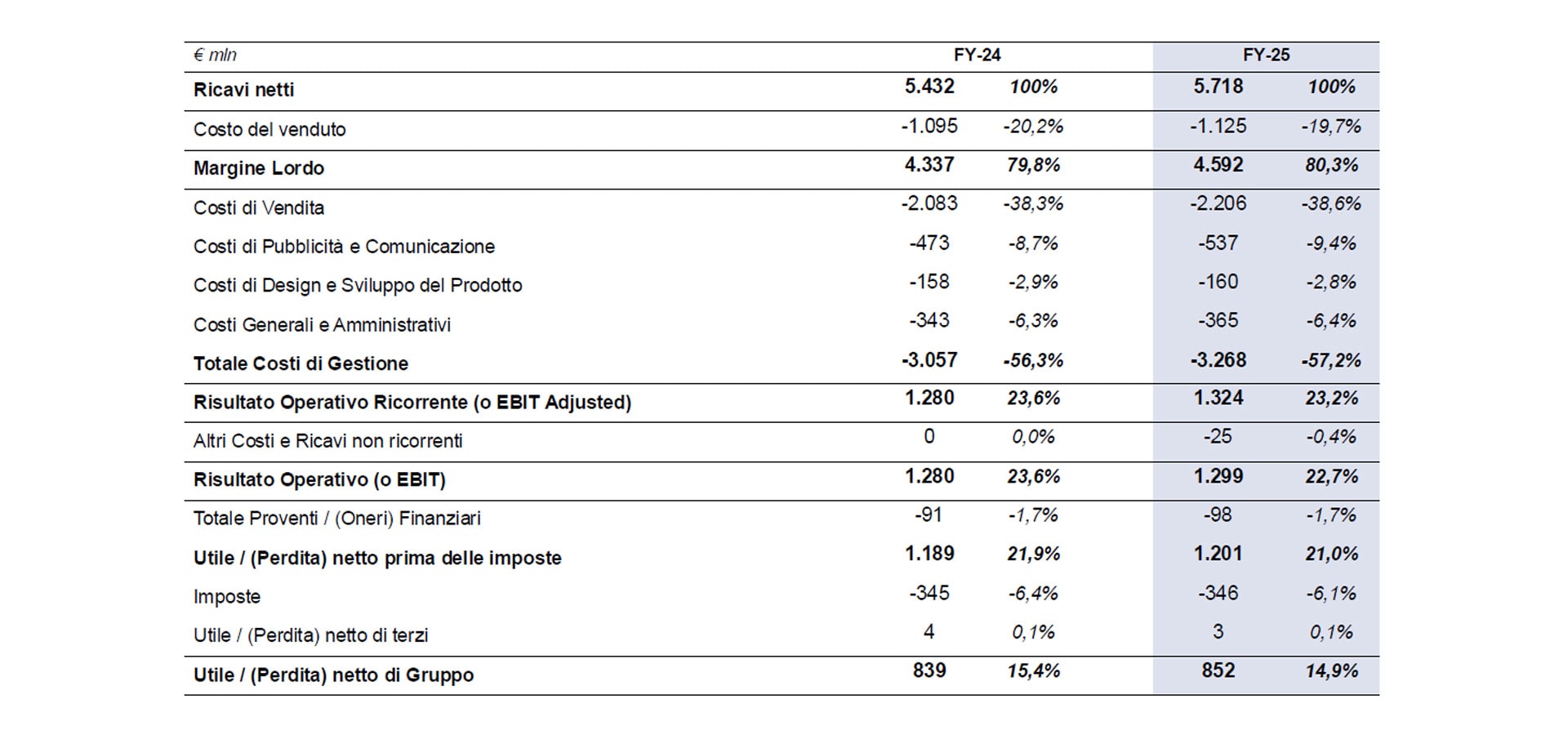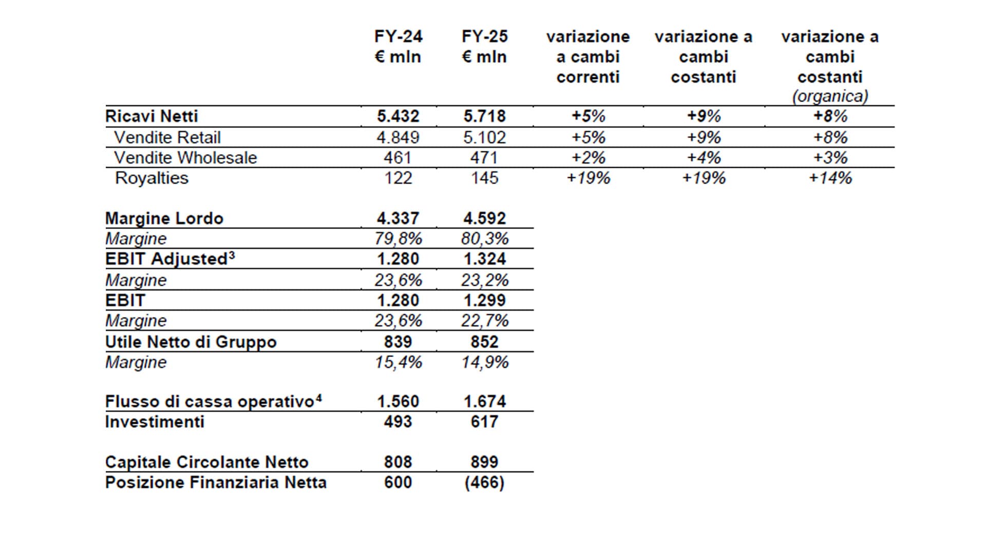 3 L’EBIT Adjusted non include altri proventi e oneri non ricorrenti nell’esercizio 2025 e include l’impatto di Versace dal 2 dicembre 2025