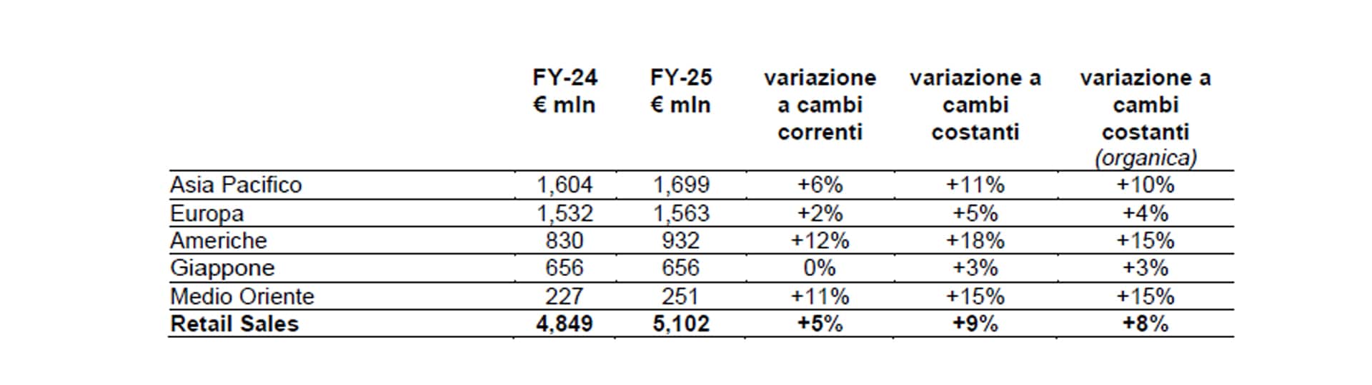 Performance positiva in Europa con una crescita del 5%, +4% organico; trend più moderato nel secondo semestre, che ha risentito di minori flussi turistici e domanda locale impattata da una base di confronto pluriennale sfidante.