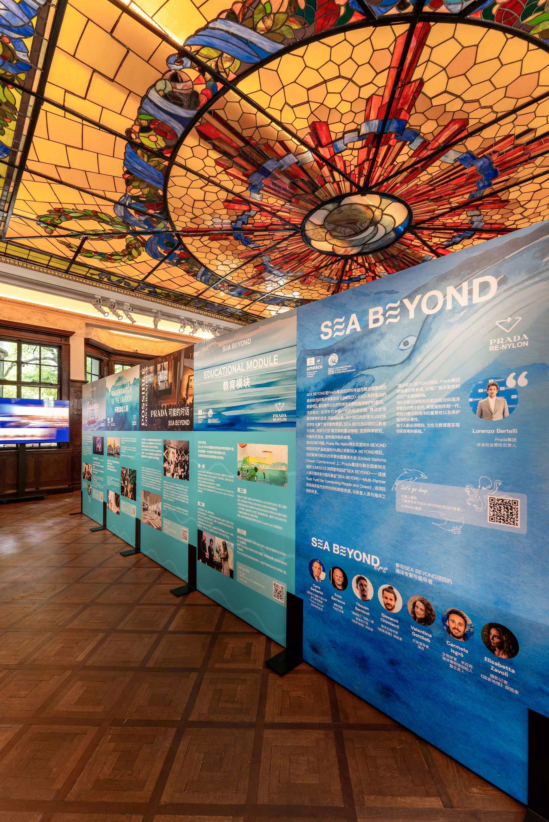 L'Ocean & Climate Village - la mostra scientifica itinerante, immersiva e interattiva sviluppata dalla Commissione Oceanografica Intergovernativa (COI) dell’UNESCO che esplora le complesse connessioni tra oceano e clima globale – accoglierà gli ospiti nella Ballroom, la storica sala di Prada Rong Zhai originariamente destinata a feste ed eventi formali, sotto una grande vetrata composta da sessantanove pannelli. I visitatori esploreranno il ruolo dell’oceano nella regolazione del clima terrestre attraverso aree tematiche con il supporto di strumenti interattivi come infografiche, fotografie e installazioni tattili. Tra questi: l’installazione UpSeaDown, che mostra la relazione tra riscaldamento globale e aumento del volume dell’oceano nell’arco temporale 1940-2100 e Feel the Change, che consente di toccare con mano la ricostruzione di ecosistemi marini sia allo stato naturale sia danneggiati dall’acidificazione. FIO (First Institute of Oceanography, Ministry of Natural Resources) e DCC-OCC (UN Decade Collaborative Centre on the Ocean-Climate Nexus and Coordination Amongst Decade Implementing Partners in P.R. China) hanno contribuito all’adattamento della mostra al contesto locale.
