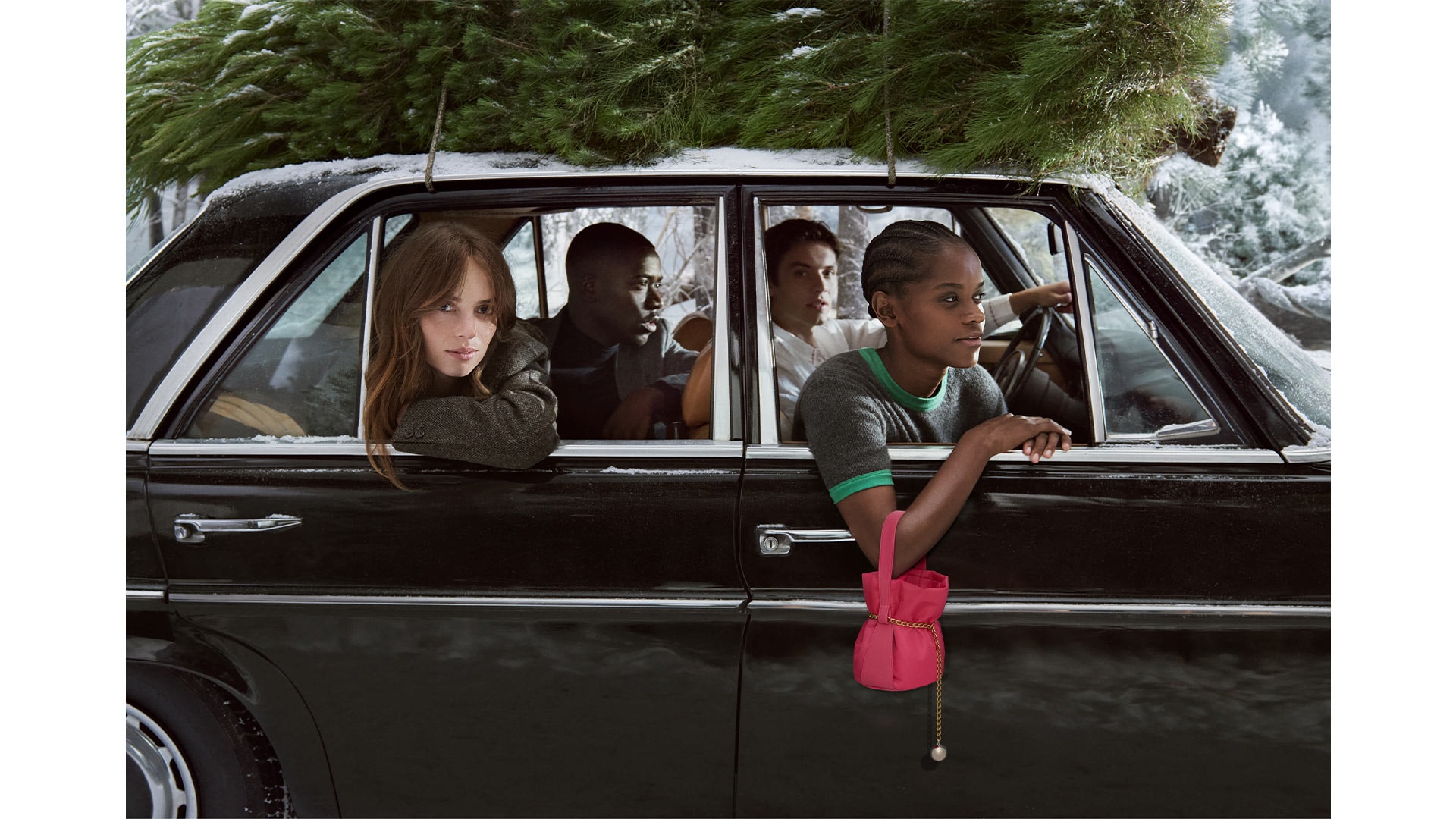 Cinematic in scope, panoramic in scale, these still and moving images echo a long tradition of Prada campaigns inspired by movie auteurs. Filmed and photographed by Glen Luchford, the epic vision is brought to life by bold and youthful international talents: Maya Hawke, Damson Idris, Louis Partridge, Letitia Wright, and Li Xian They convene as friends, a chosen family making the trip together.