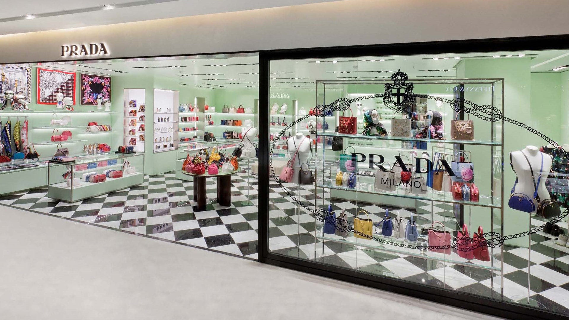 グリーンの壁とキャンバスパネルが印象的な内装を、ガラスのディスプレイ棚と木製のテーブルがさらに引き立てています。インテリアは、ミラノのガレリア・ヴィットリオ・エマヌエーレⅡ世にある歴史あるプラダショップを思わせる、代表的な白黒の市松模様の大理石の床が特徴です。