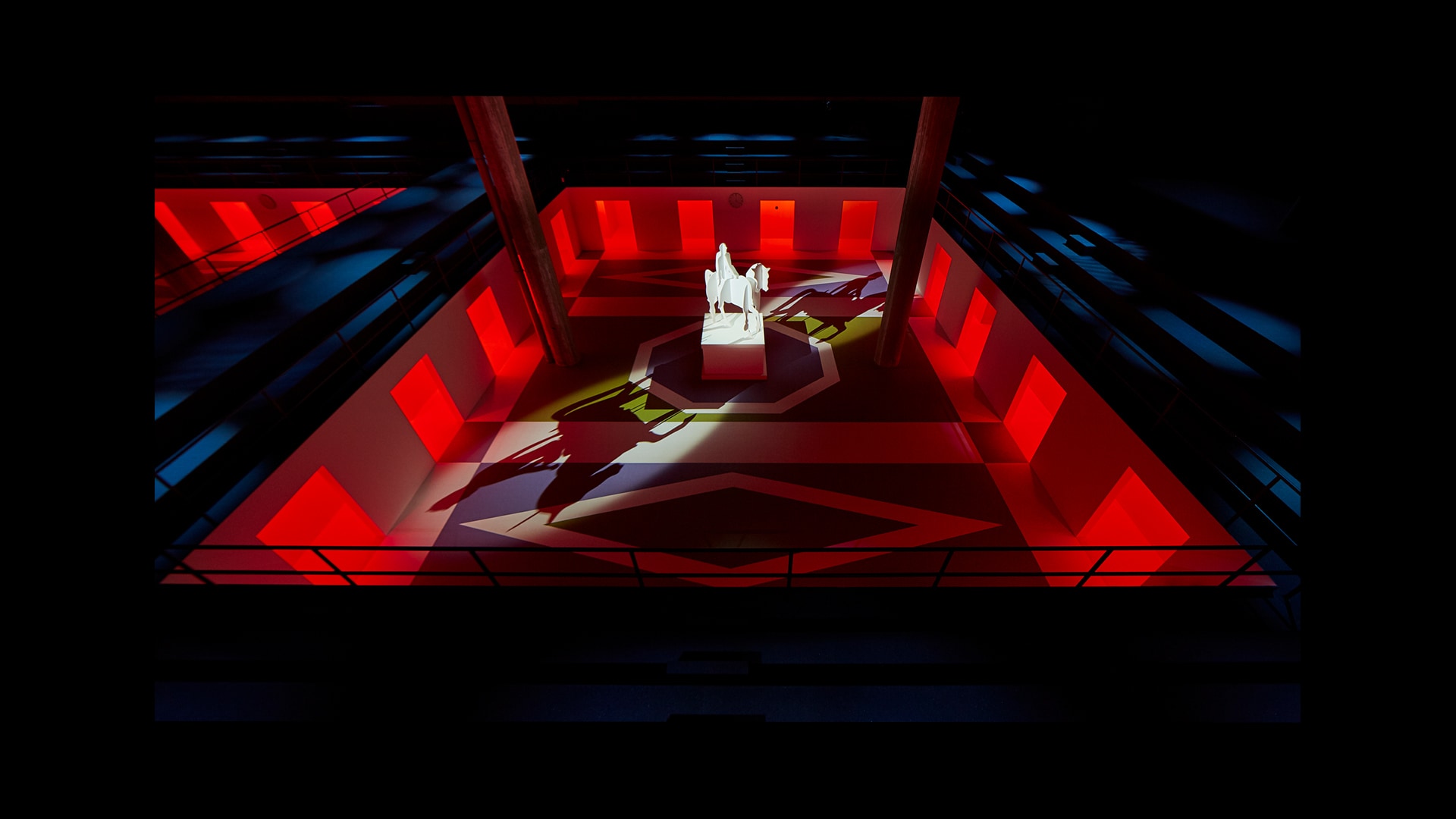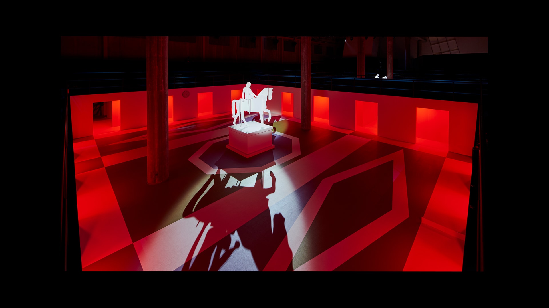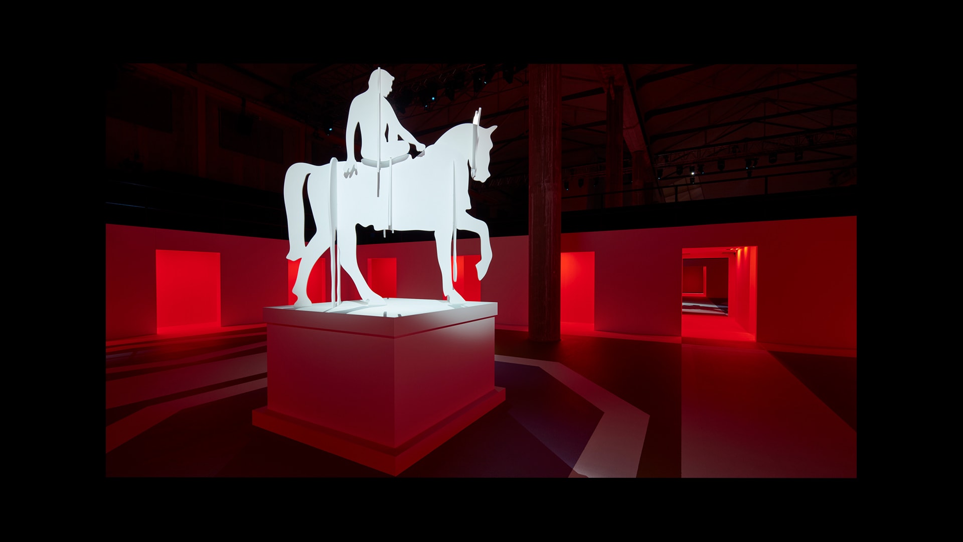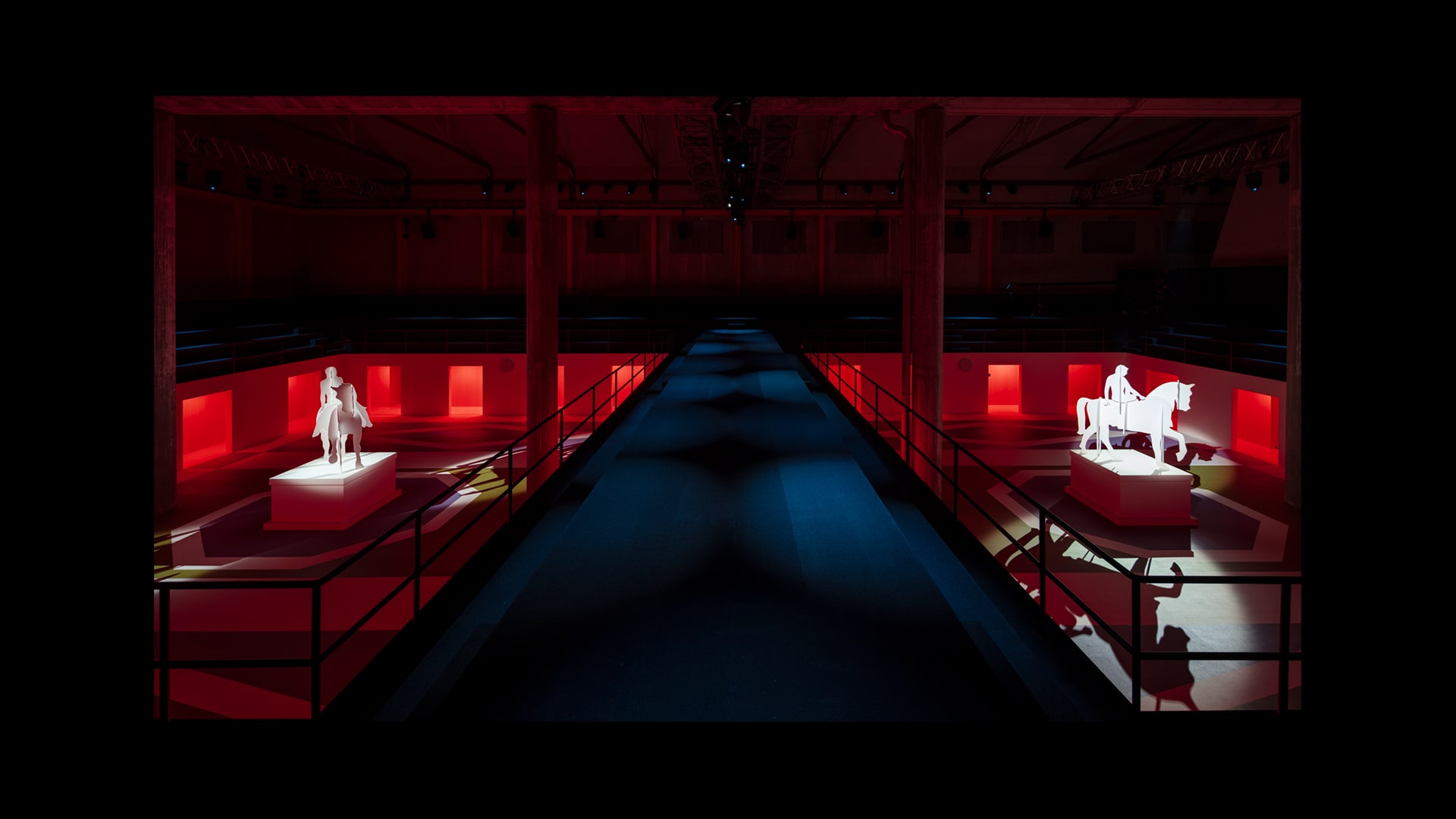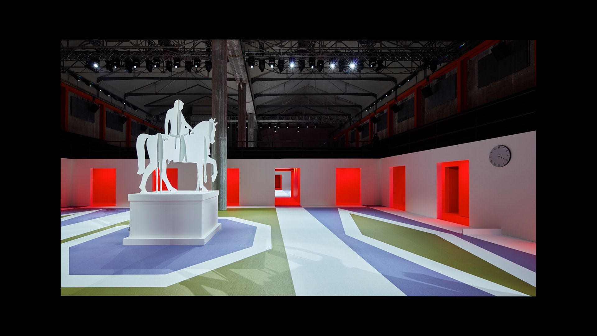 プラダ2020年秋冬メンズウェアファッションショーでは、AMOによりDepositoの空間が新たな姿に変身。公共の場に満ちる抽象的なエネルギーを体現した、想像上のピアッツァ(広場)へと変貌を遂げました。覆いのないむき出しの舞台に並ぶのは、対照的に開けられた入り口の数々。強烈なレッドライトを照らして奥行を出した開口部は、建築の裏に隠れている不思議なポーチとピアッツァという公共スペースとの境界になっています。両広場の中央に設置されているのは、視覚的なアクセントや三次元の座標軸の役割を果たしている、抽象的な像です。 秋の午後の陽が描く長い影さながらに、像がシャープな影をフロアに落とし、正方形の舞台とグラフィックデザインを引き立てています。会場は、観客が舞台の上方に座る設計。観客はルックが登場するステージから離れていると同時に、それを覗き見るようにデザインされています。姿を現しては消えていくモデルたちは、見える場所と見えない場所の境界がぼやけるような目に見えない軌道に乗って、ピアッツァというスペースを行き交います。