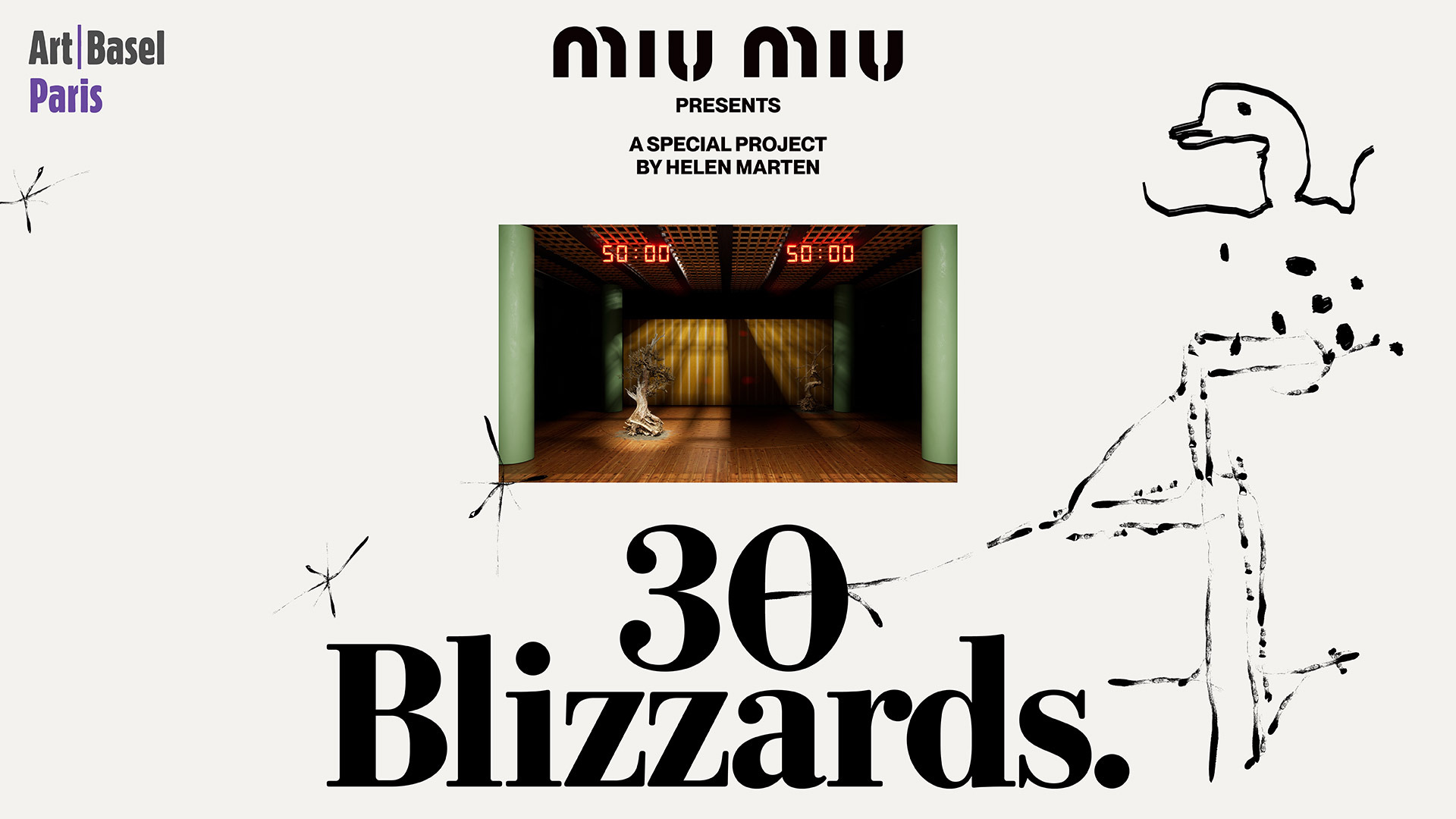 Conceived at the invitation of Miuccia Prada and Miu Miu, 30 Blizzards. is a multidisciplinary work by the artist Helen Marten. In an echo of the complexity, depth and meaning of her practice, shifting between mediums of sculpture, painting, drawing, video, performance and writing – staged at the Palais d’Iéna, Paris – open to public from 22-26 October 2025 as part of Art Basel Paris, Public Program Official partner.