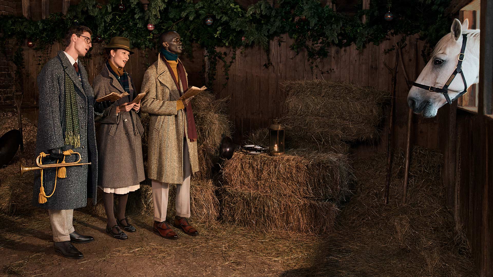 La narrazione prosegue con uno spontaneo concerto di canti natalizi nelle stalle. I cappotti sartoriali e la maglieria vivace dei gentiluomini si fondono armoniosamente con le iconiche Oxford Hampstead e Mayfair di Church’s, creando un equilibrio perfetto di eleganza e comfort. Lei, invece, aggiunge al suo look un tocco dal fascino rétro con le Opal Met Mary Jane in nappa nere, impreziosite da piccole borchie.