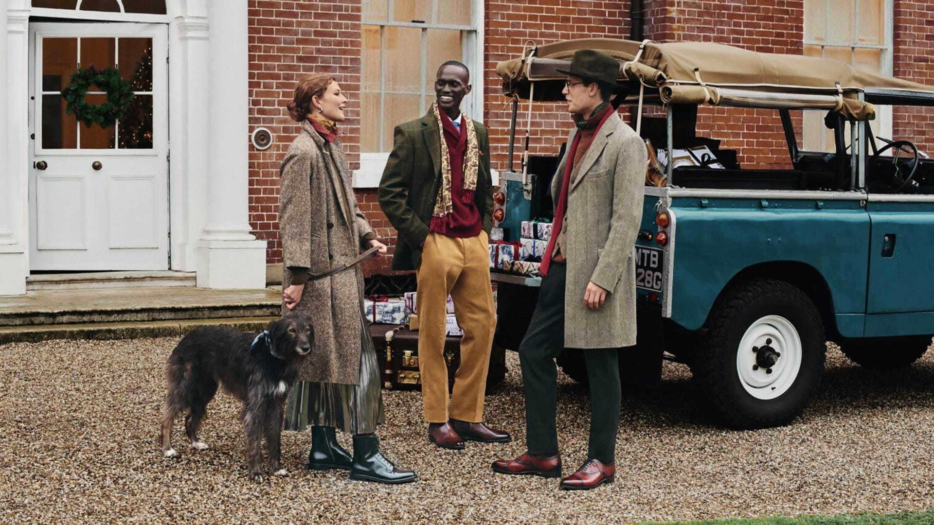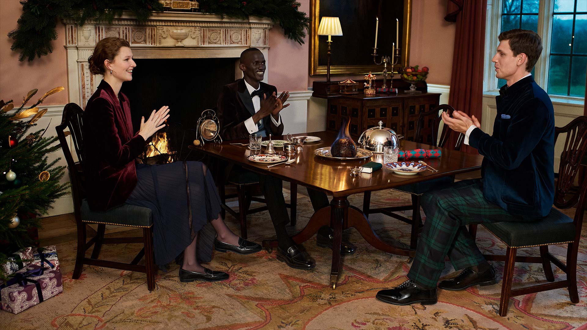 Forse rinvigoriti dal gusto avvolgente di un pudding natalizio, i tre protagonisti si avventurano verso il prato da croquet. I gentiluomini indossano le raffinate Whaley e Oldford, mentre lei le Sovereign in velluto bordeaux, emblema di un’eleganza femminile senza tempo.