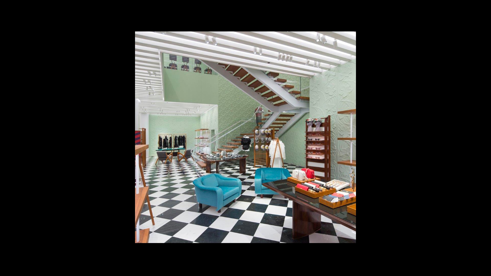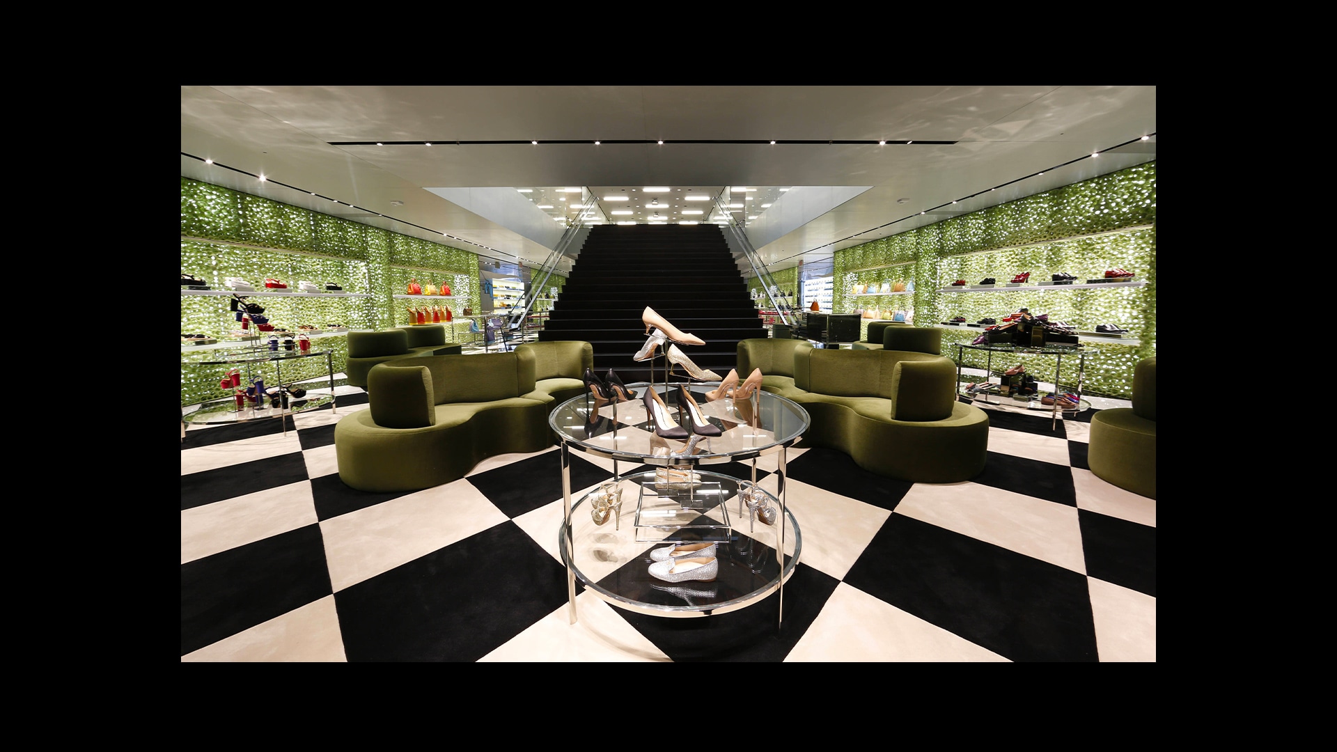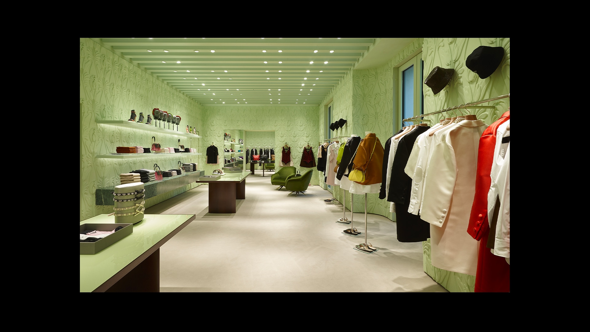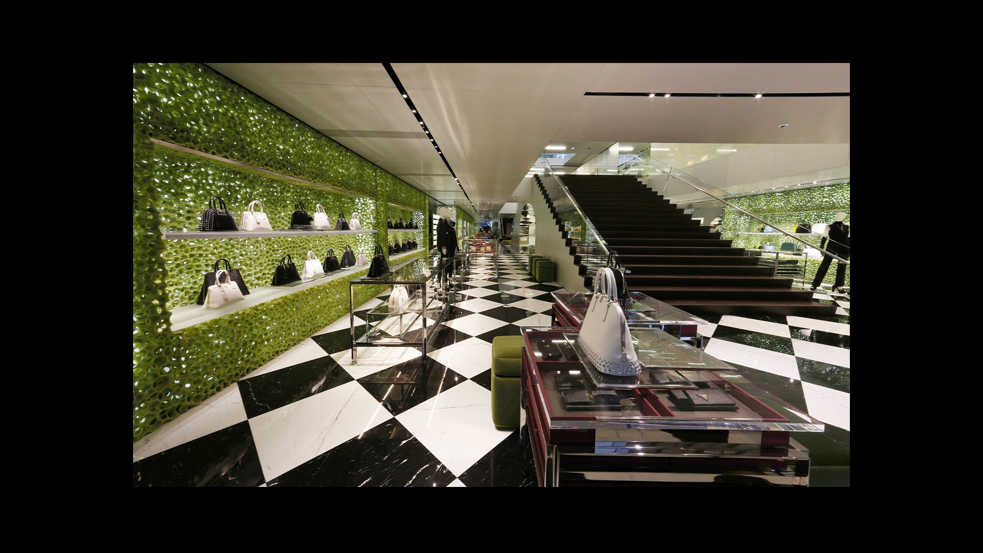 Prada绿色概念店于世界各地呈现品牌美学。浅绿色的墙壁搭配经典的黑白方格大理石地板,为展示产品系列营造理想的场景。