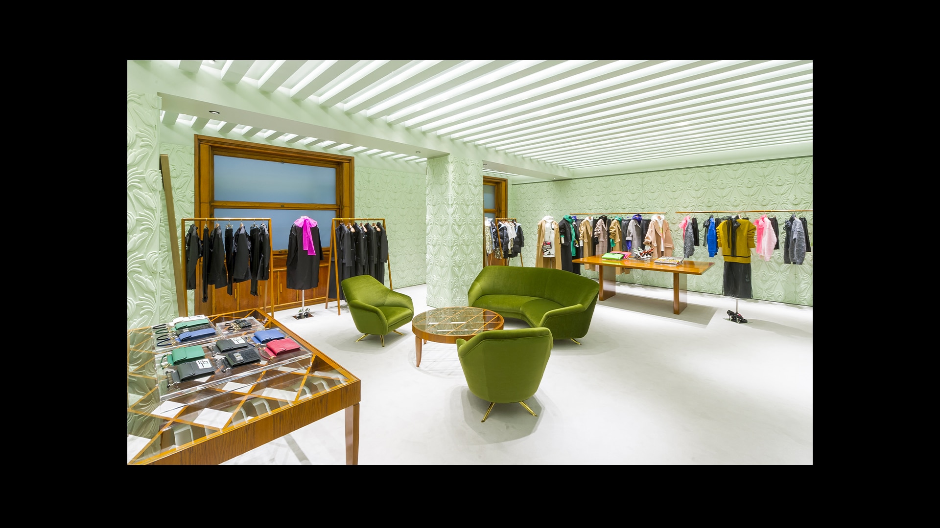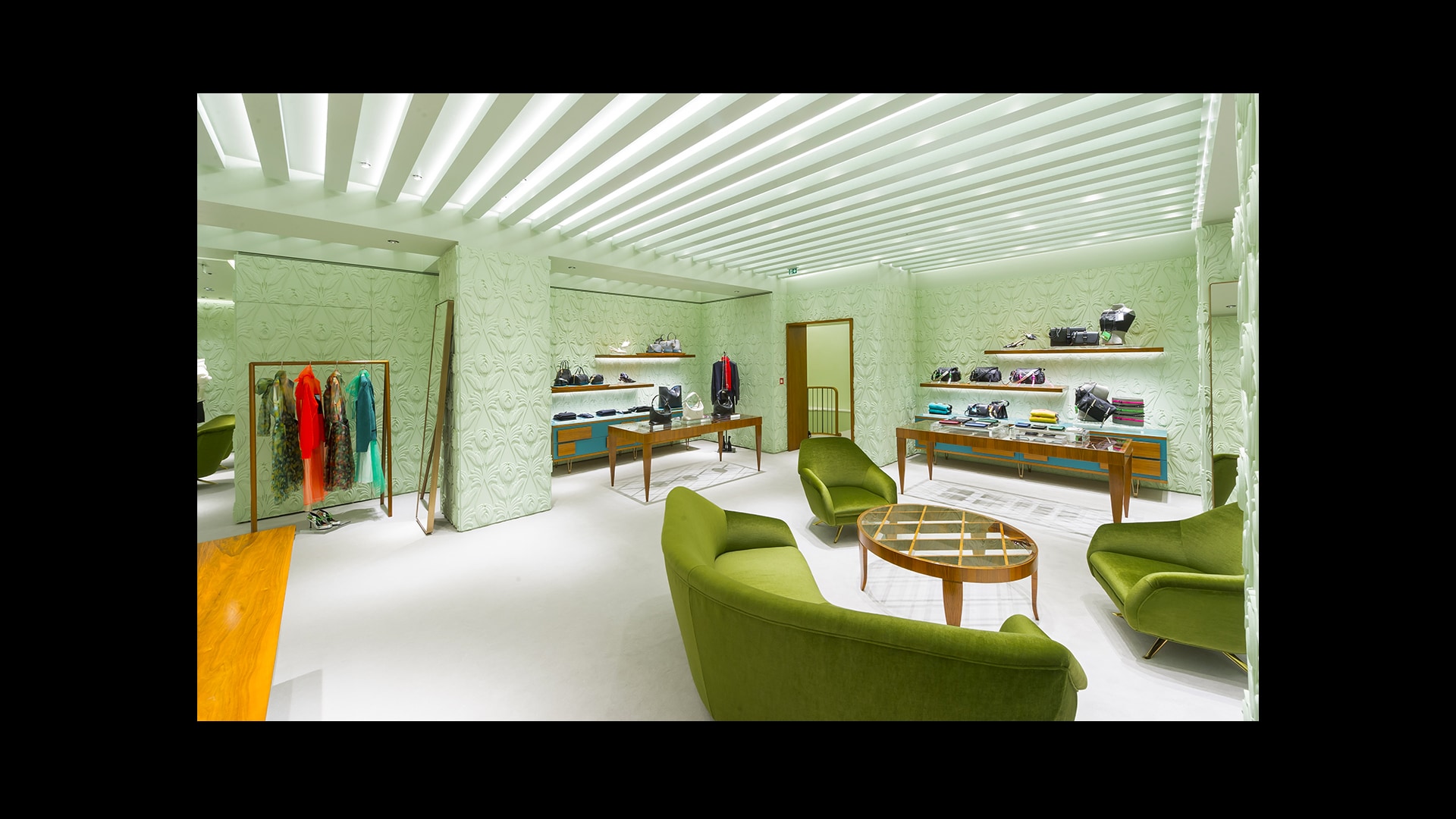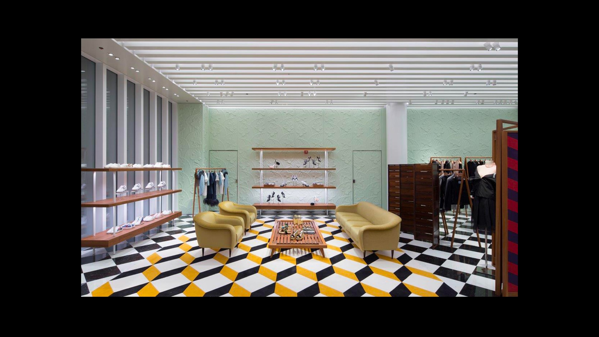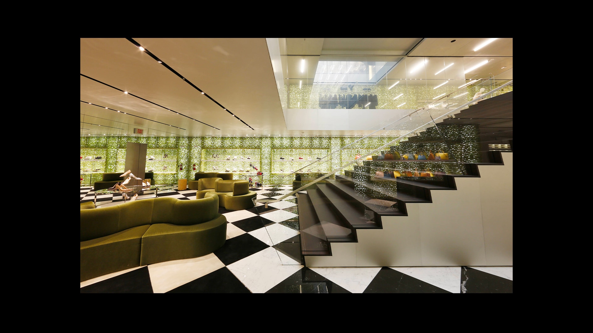Prada绿色概念店于世界各地呈现品牌美学。浅绿色的墙壁搭配经典的黑白方格大理石地板,为展示产品系列营造理想的场景。