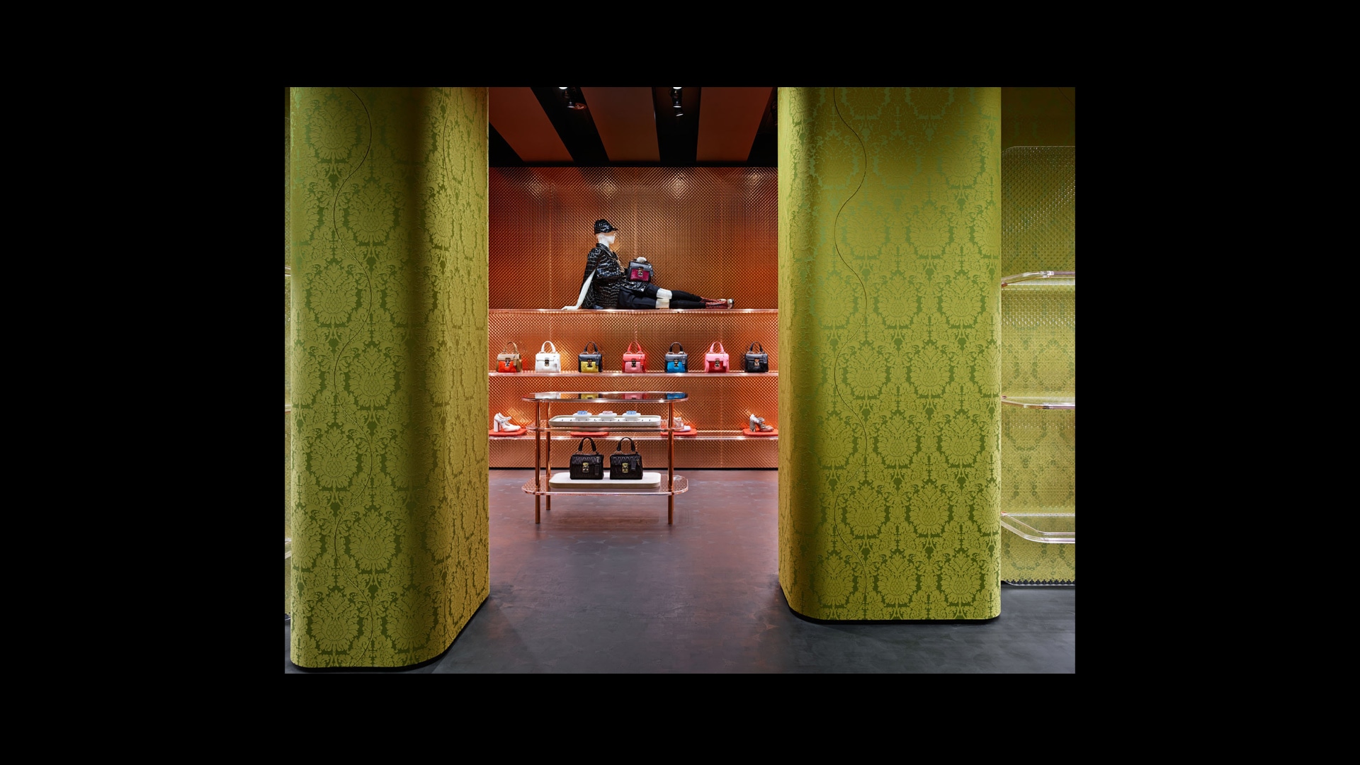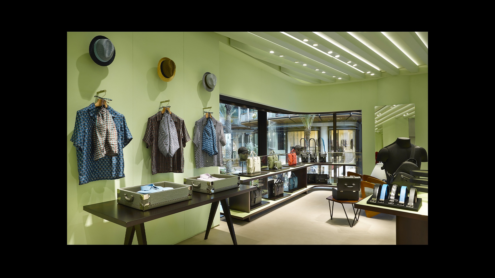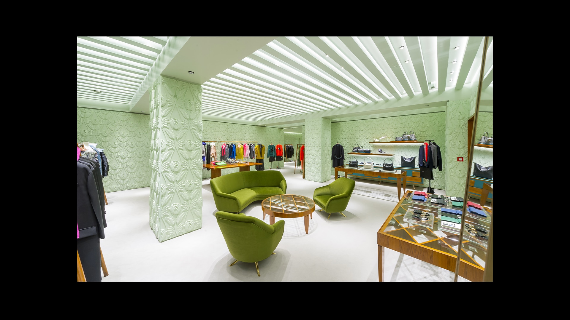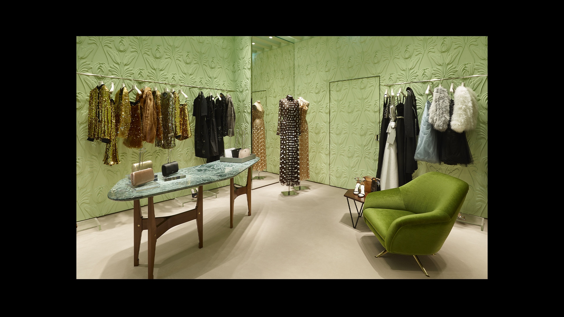Prada绿色概念店于世界各地呈现品牌美学。浅绿色的墙壁搭配经典的黑白方格大理石地板,为展示产品系列营造理想的场景。