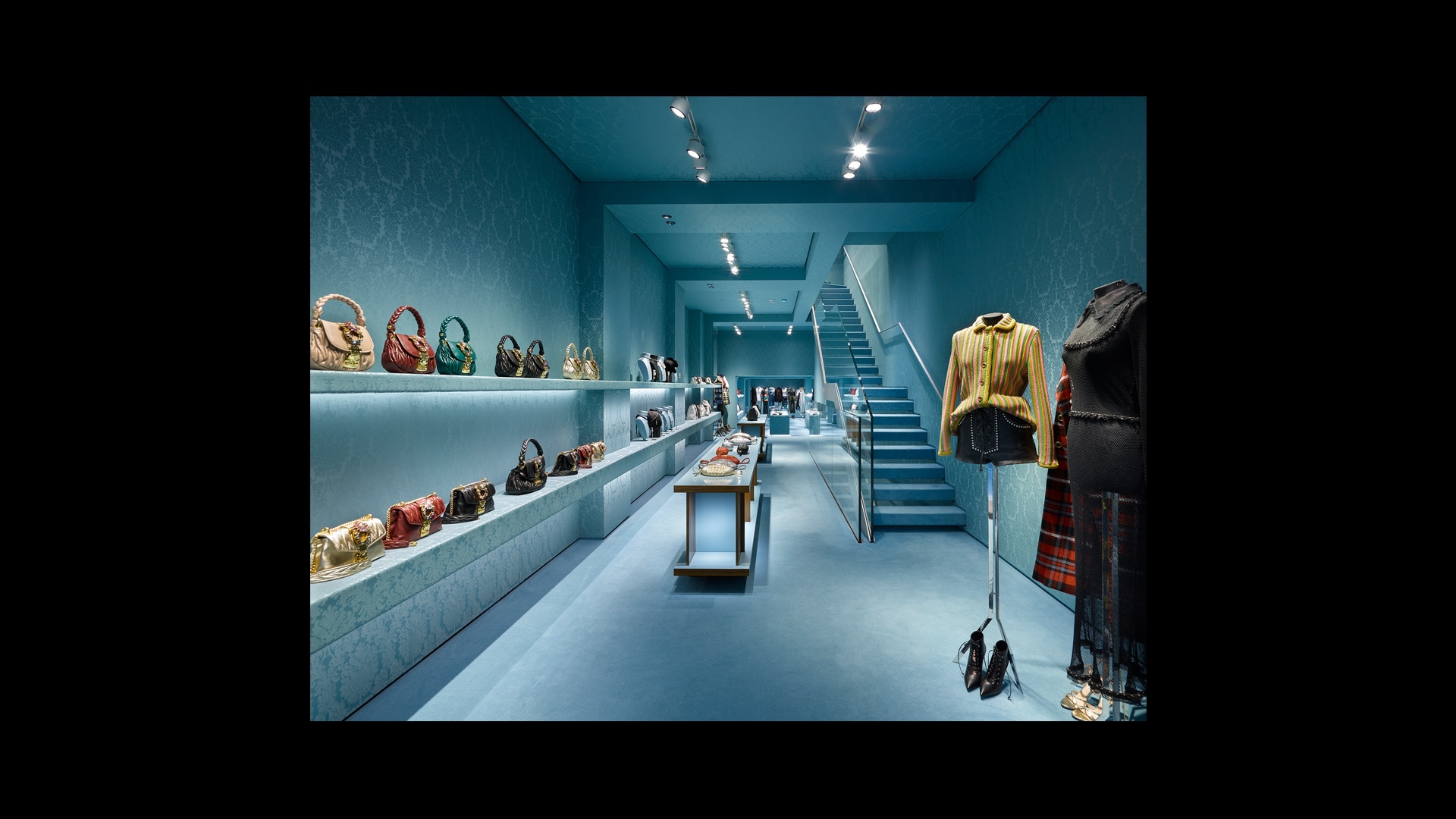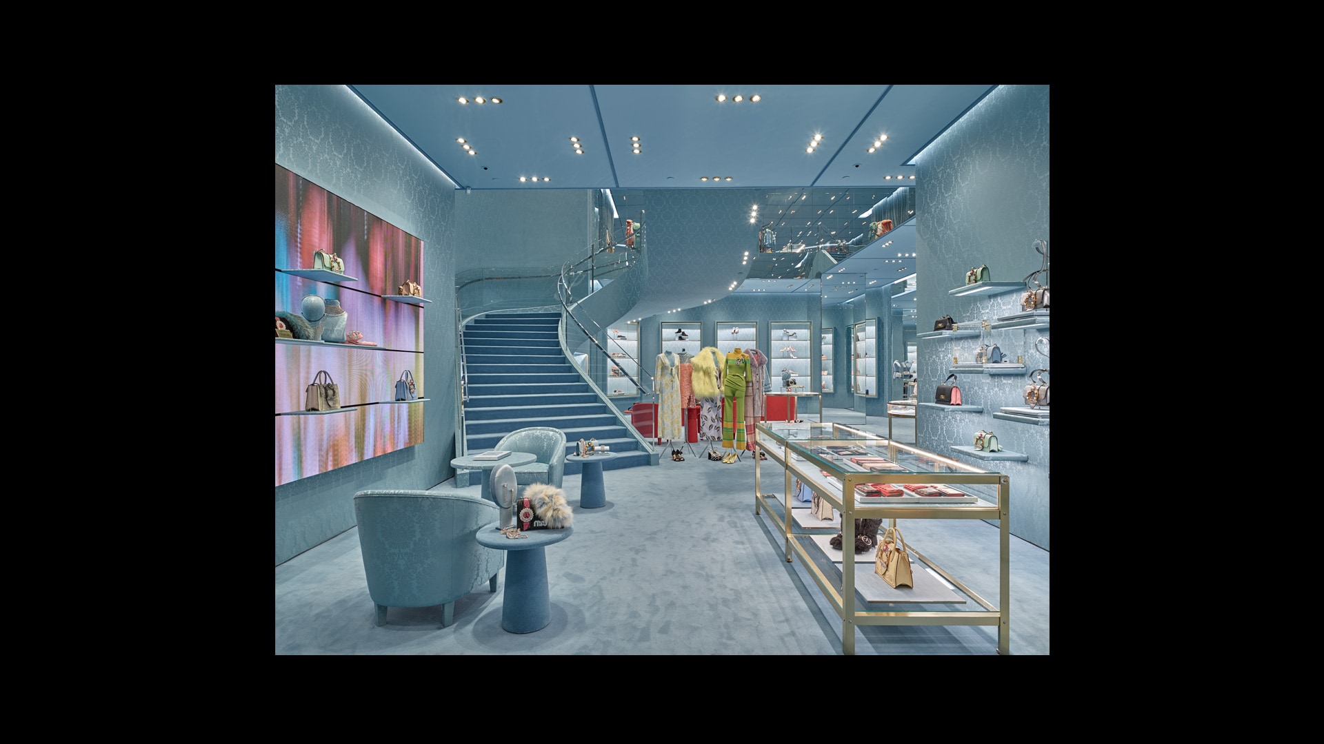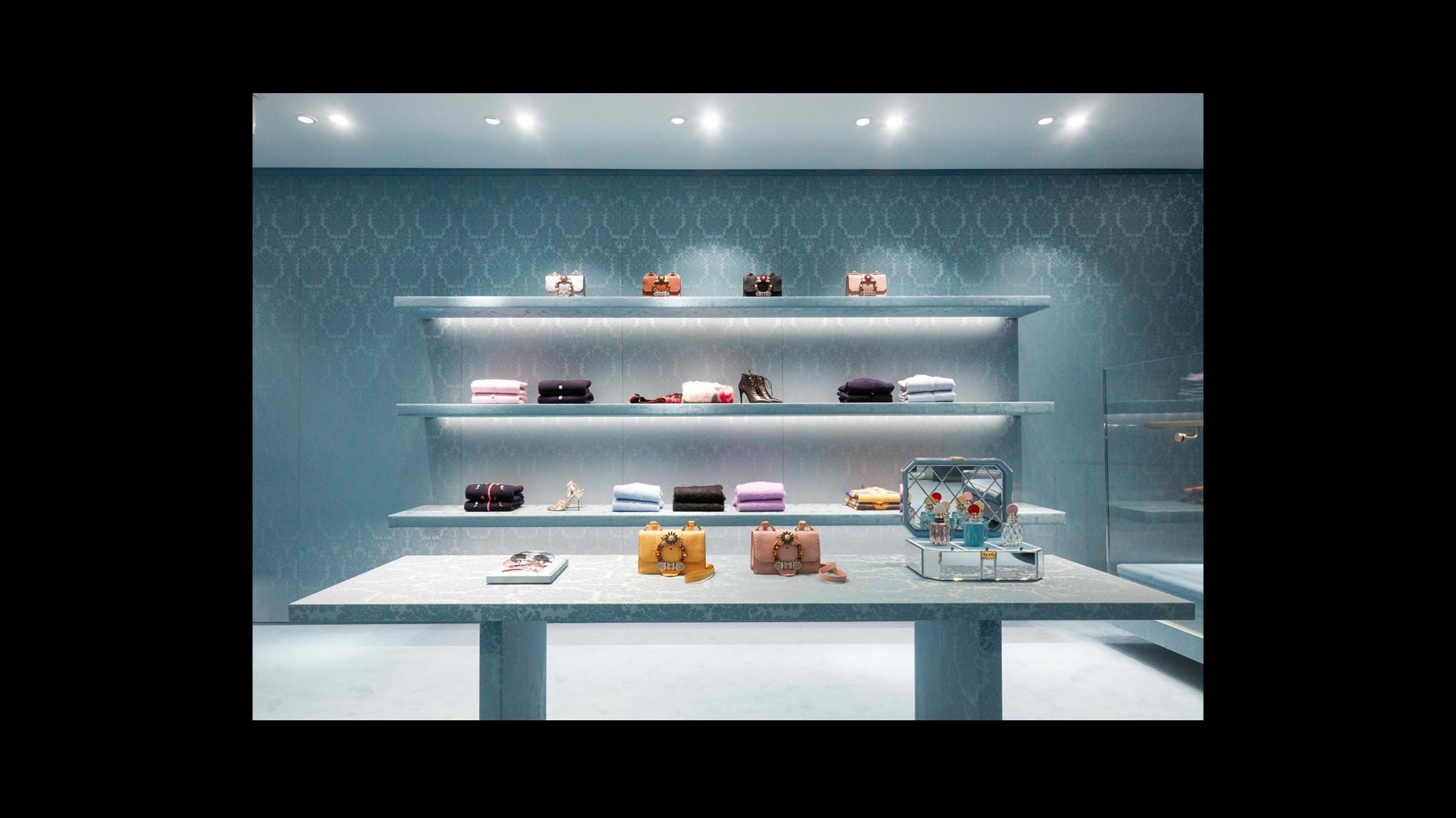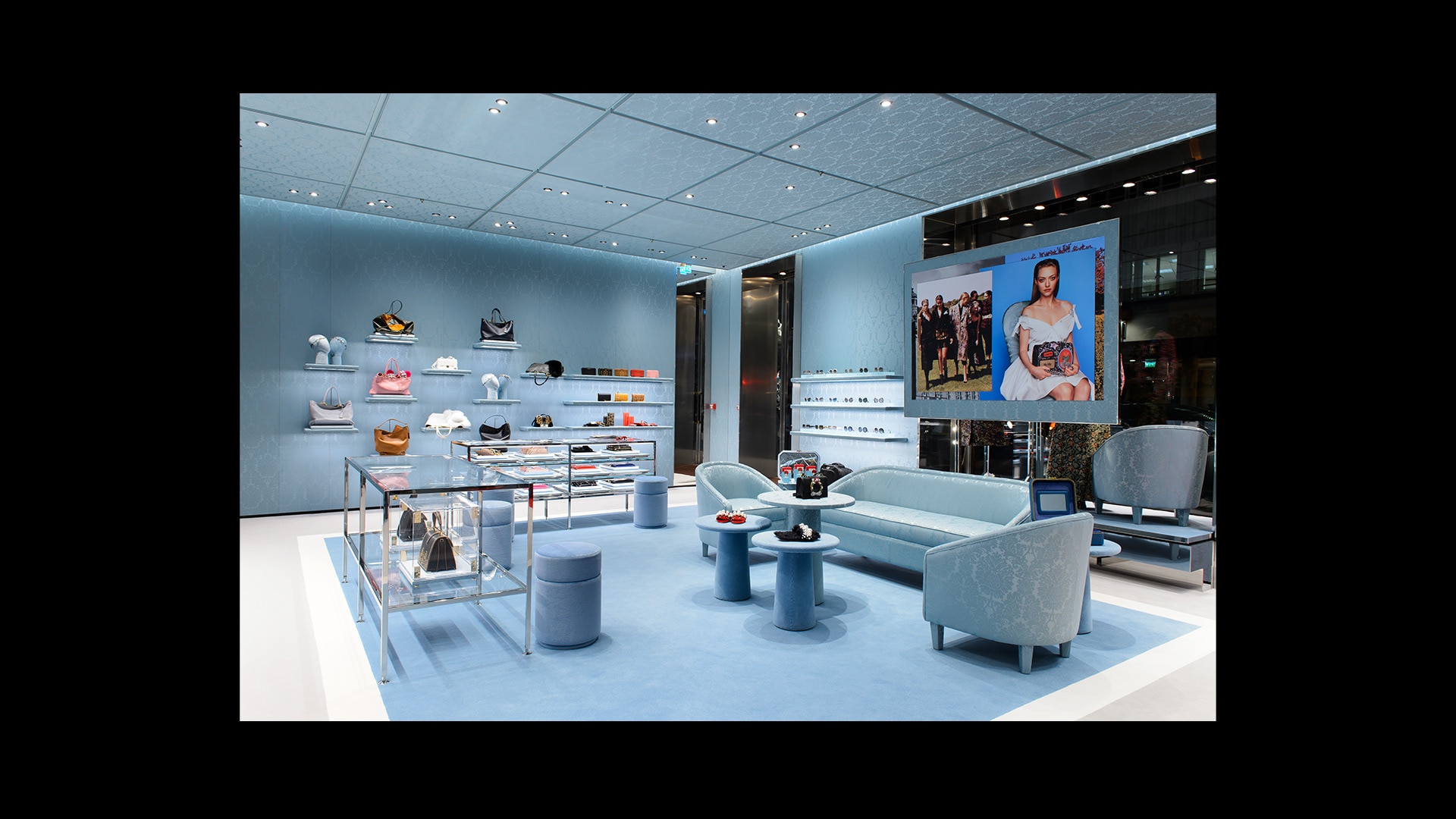 专为Miu Miu品牌打造的标志性锦缎面料,是其品牌特色贯穿全球的独特表达。天花板和地板采用同样的浅蓝色调,具有单色盒子的视觉效果,营造出亲密而时尚的氛围。