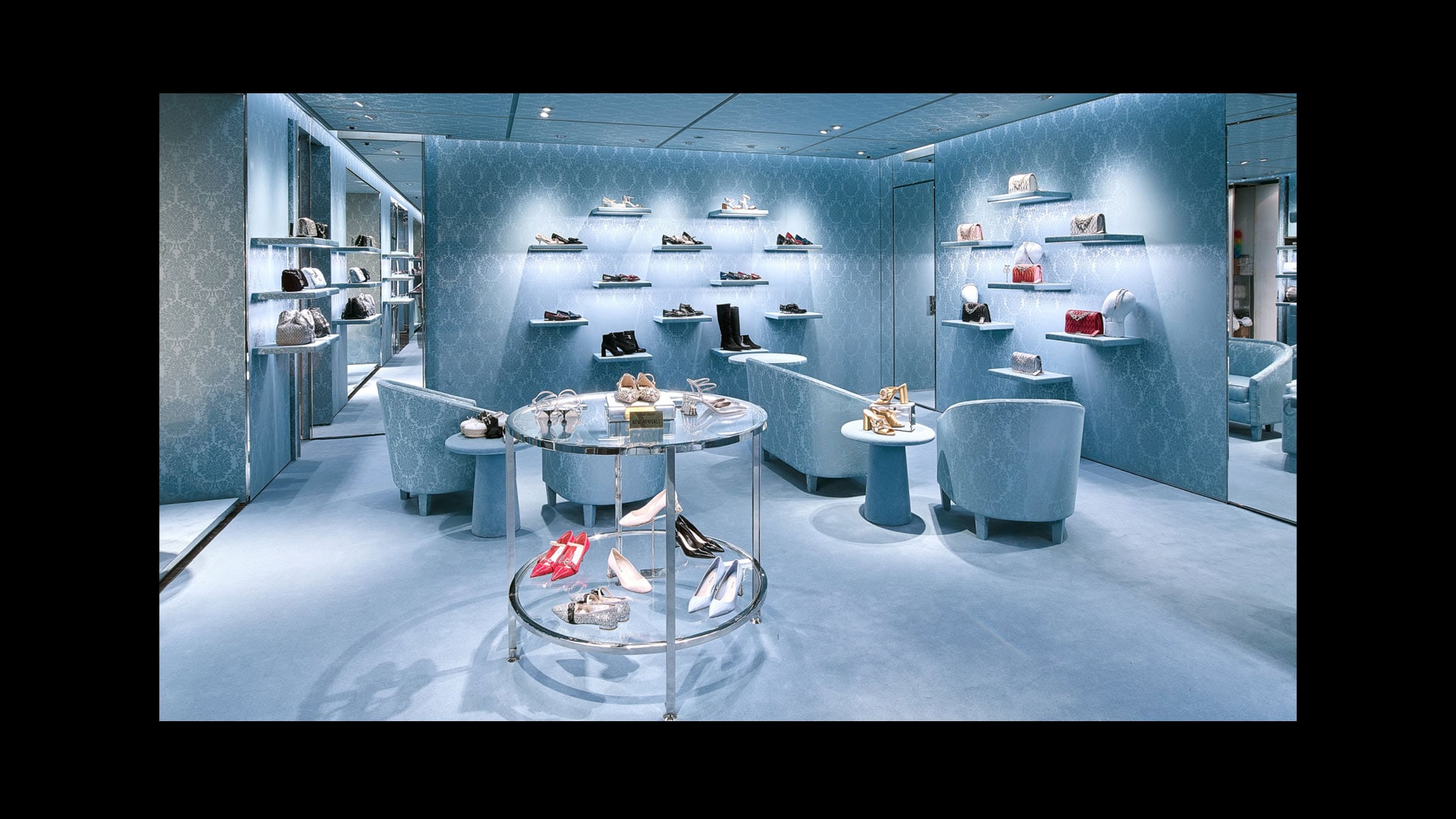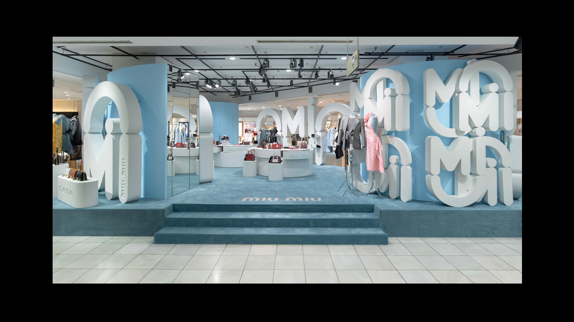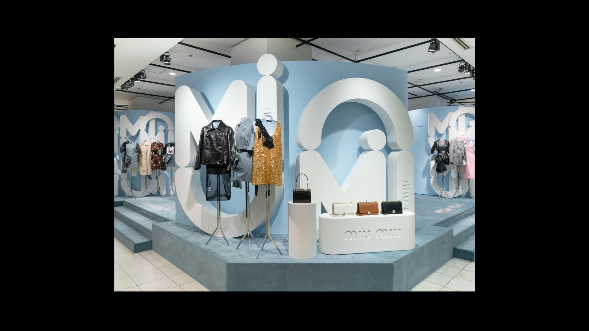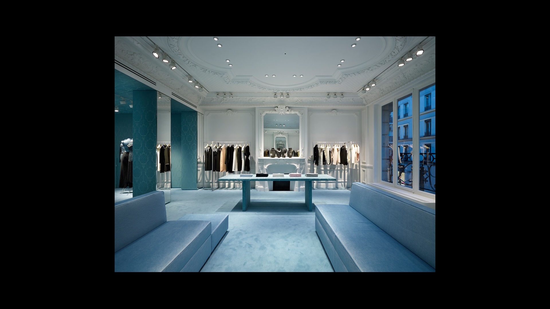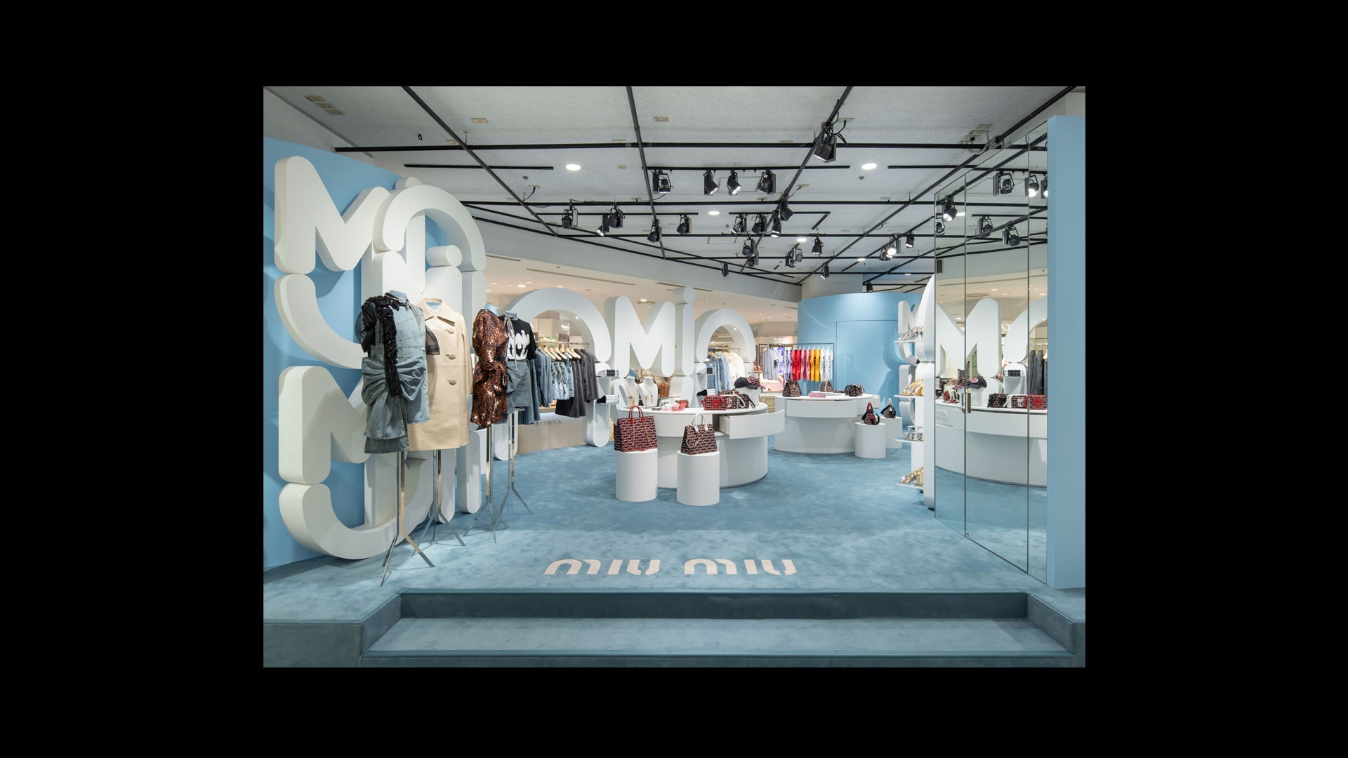 专为Miu Miu品牌打造的标志性锦缎面料,是其品牌特色贯穿全球的独特表达。天花板和地板采用同样的浅蓝色调,具有单色盒子的视觉效果,营造出亲密而时尚的氛围。