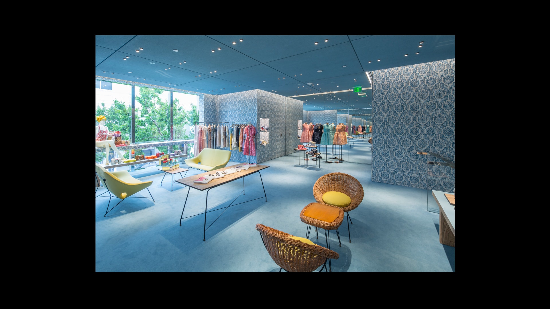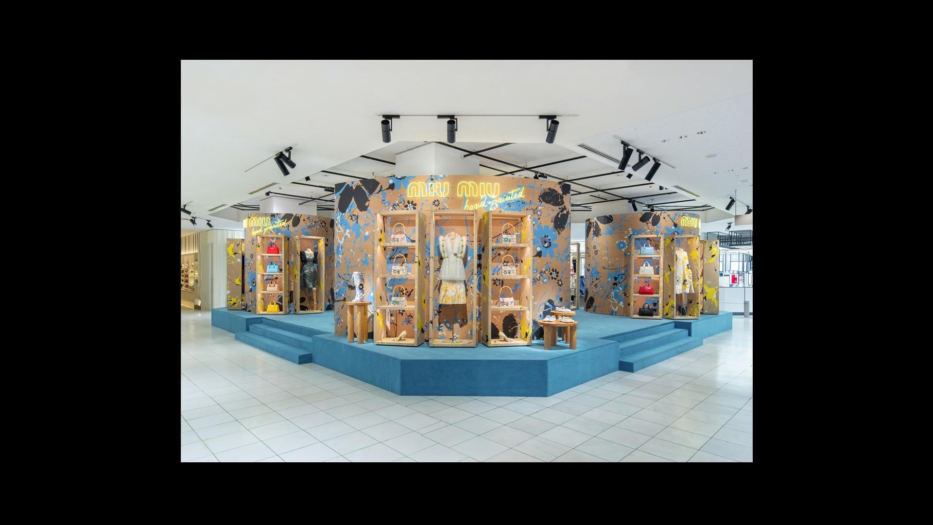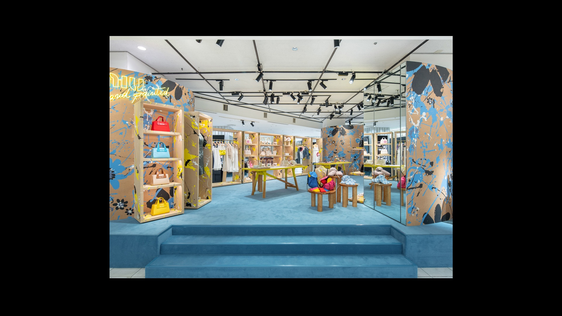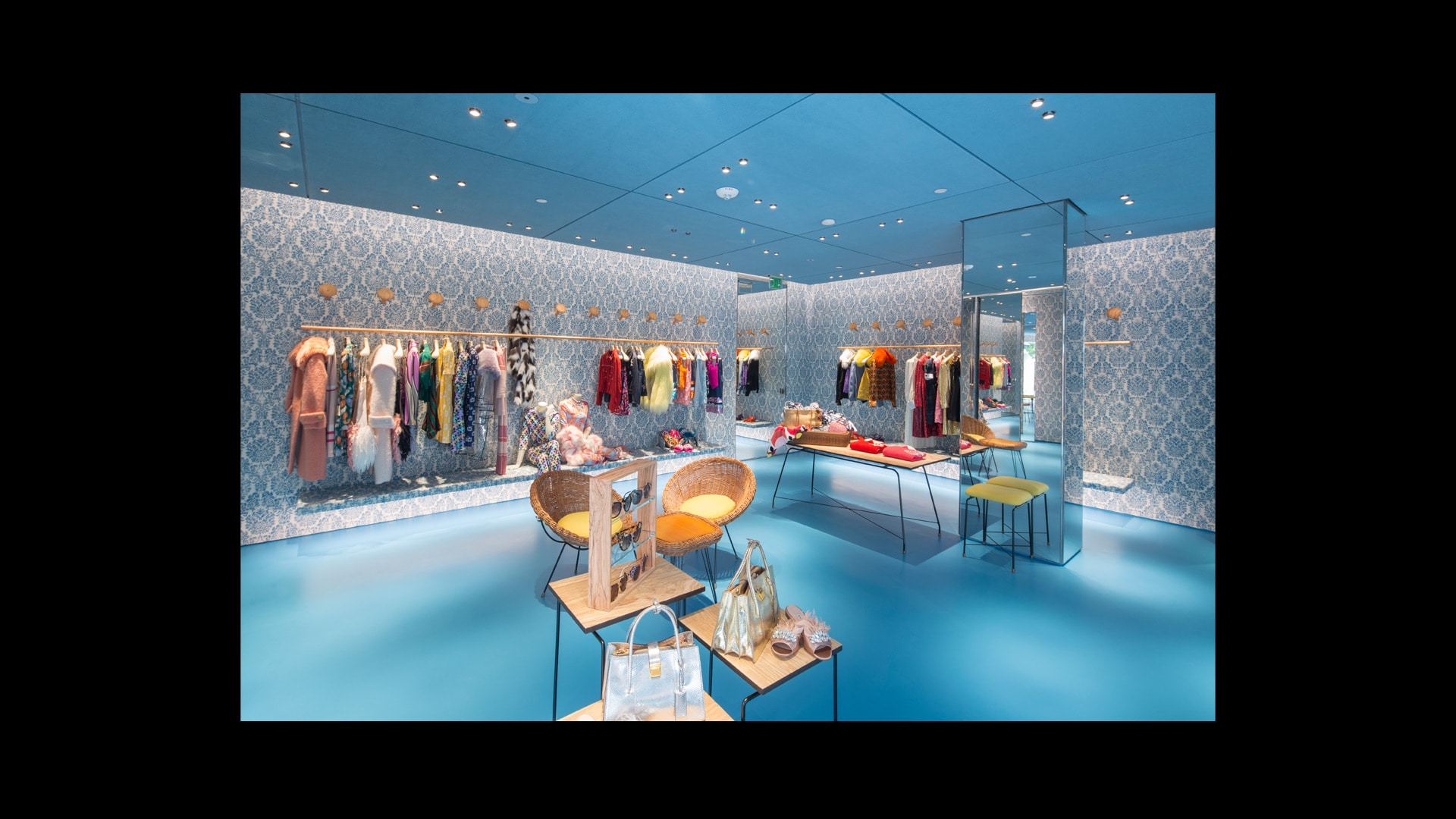 专为Miu Miu品牌打造的标志性锦缎面料,是其品牌特色贯穿全球的独特表达。天花板和地板采用同样的浅蓝色调,具有单色盒子的视觉效果,营造出亲密而时尚的氛围。