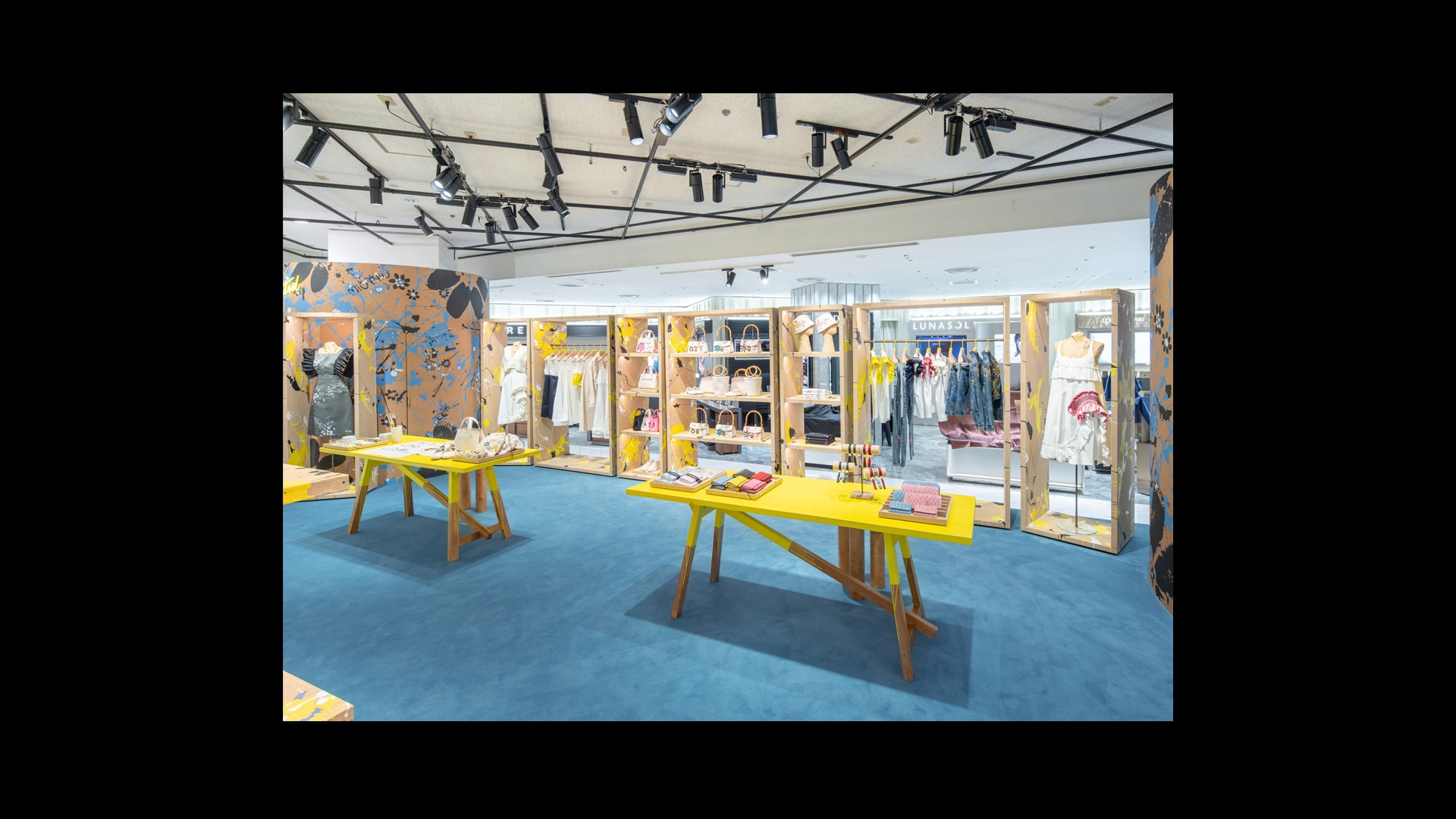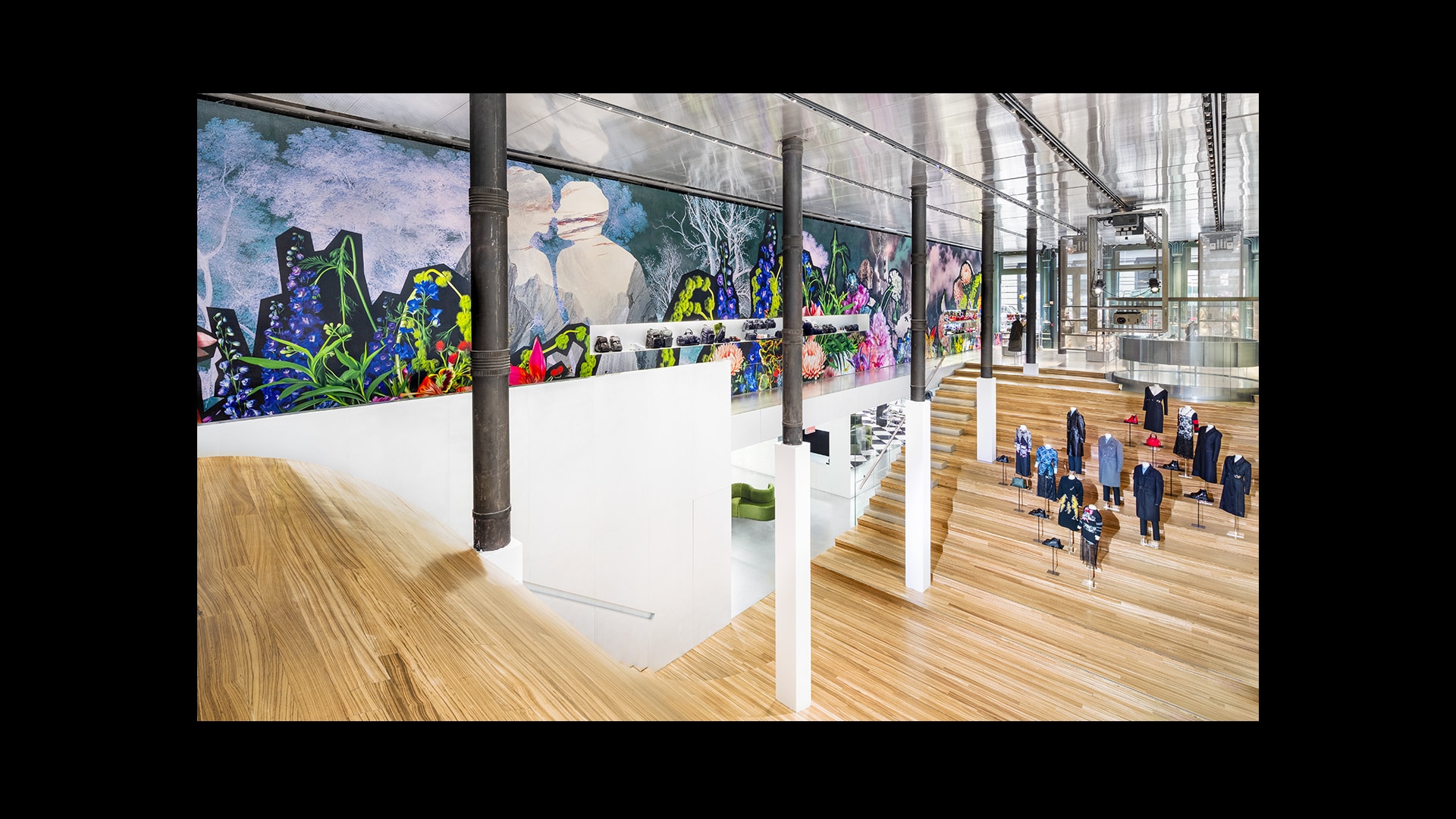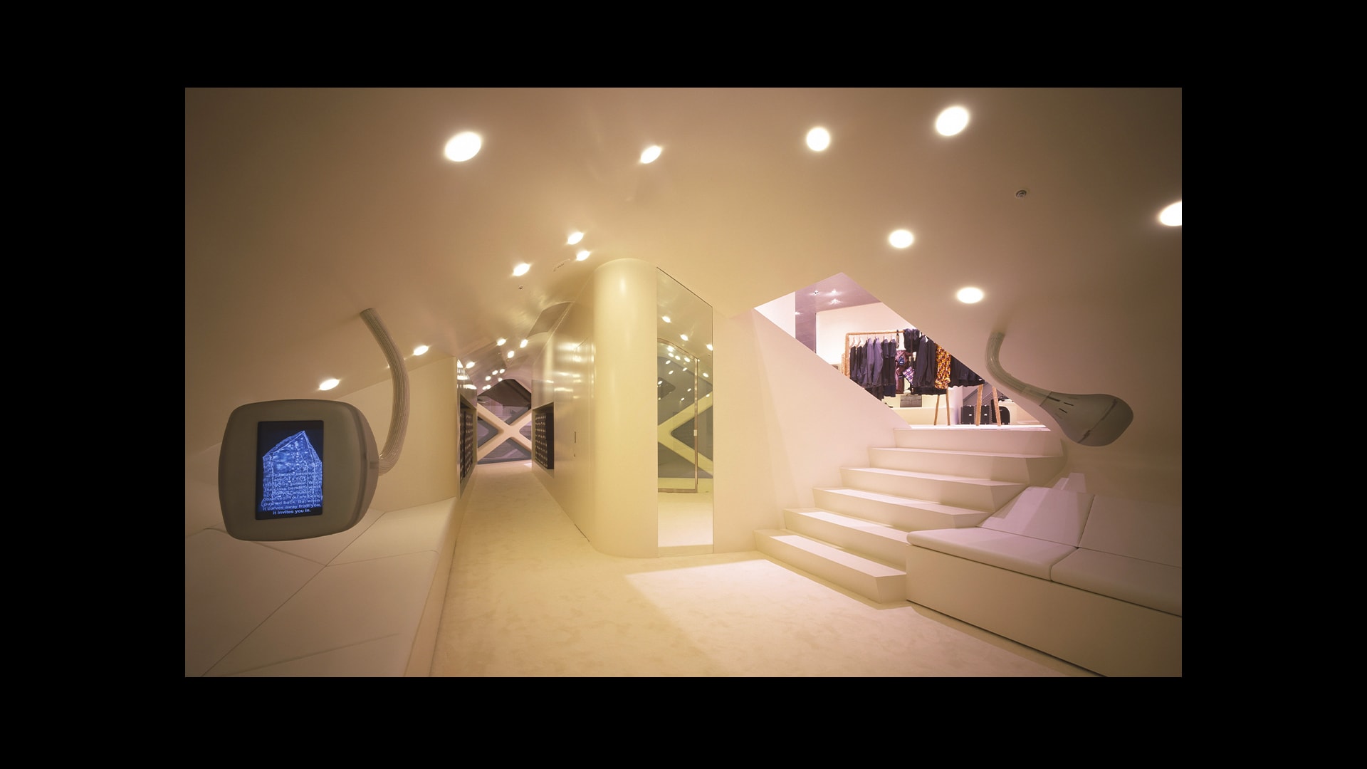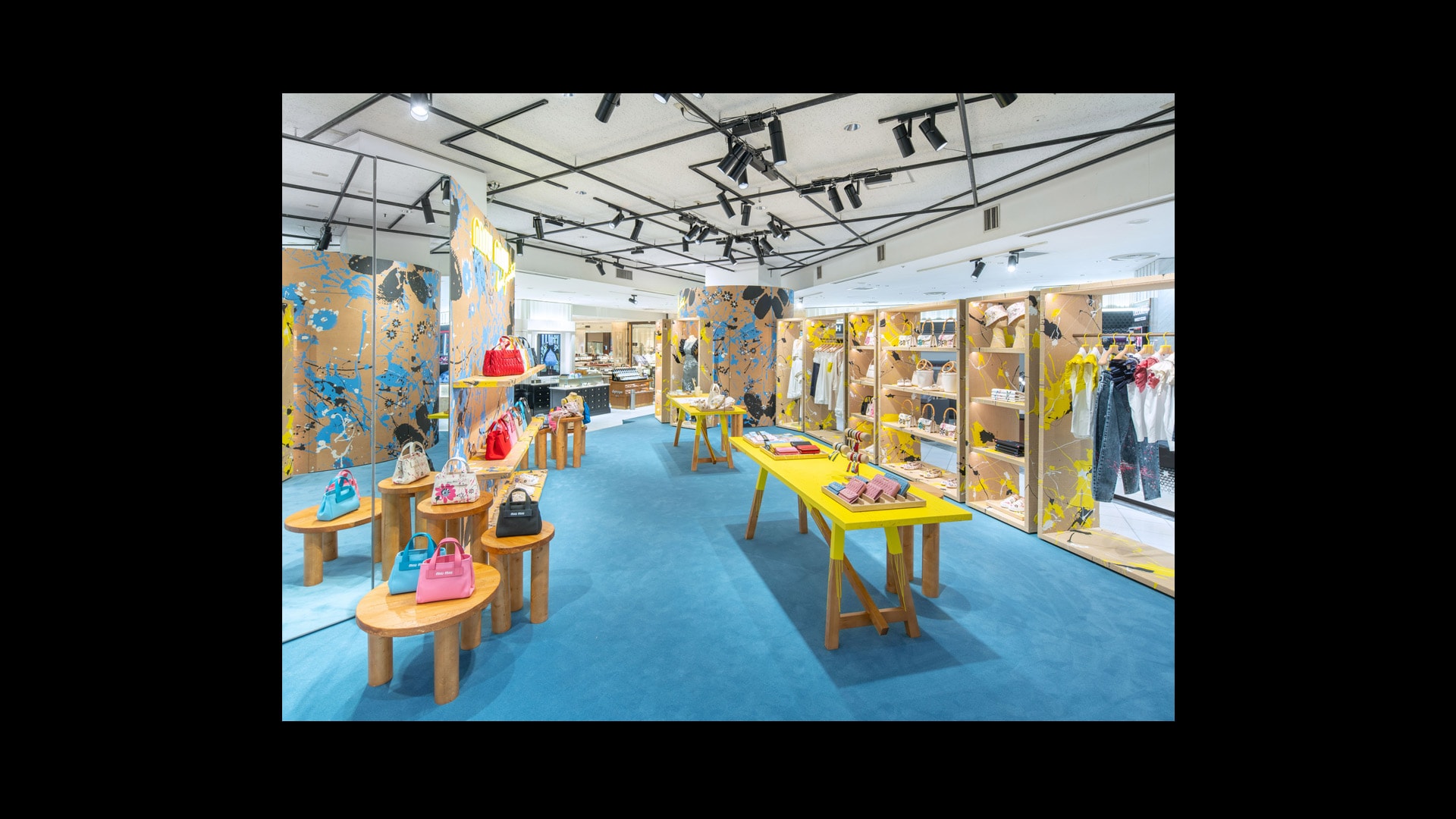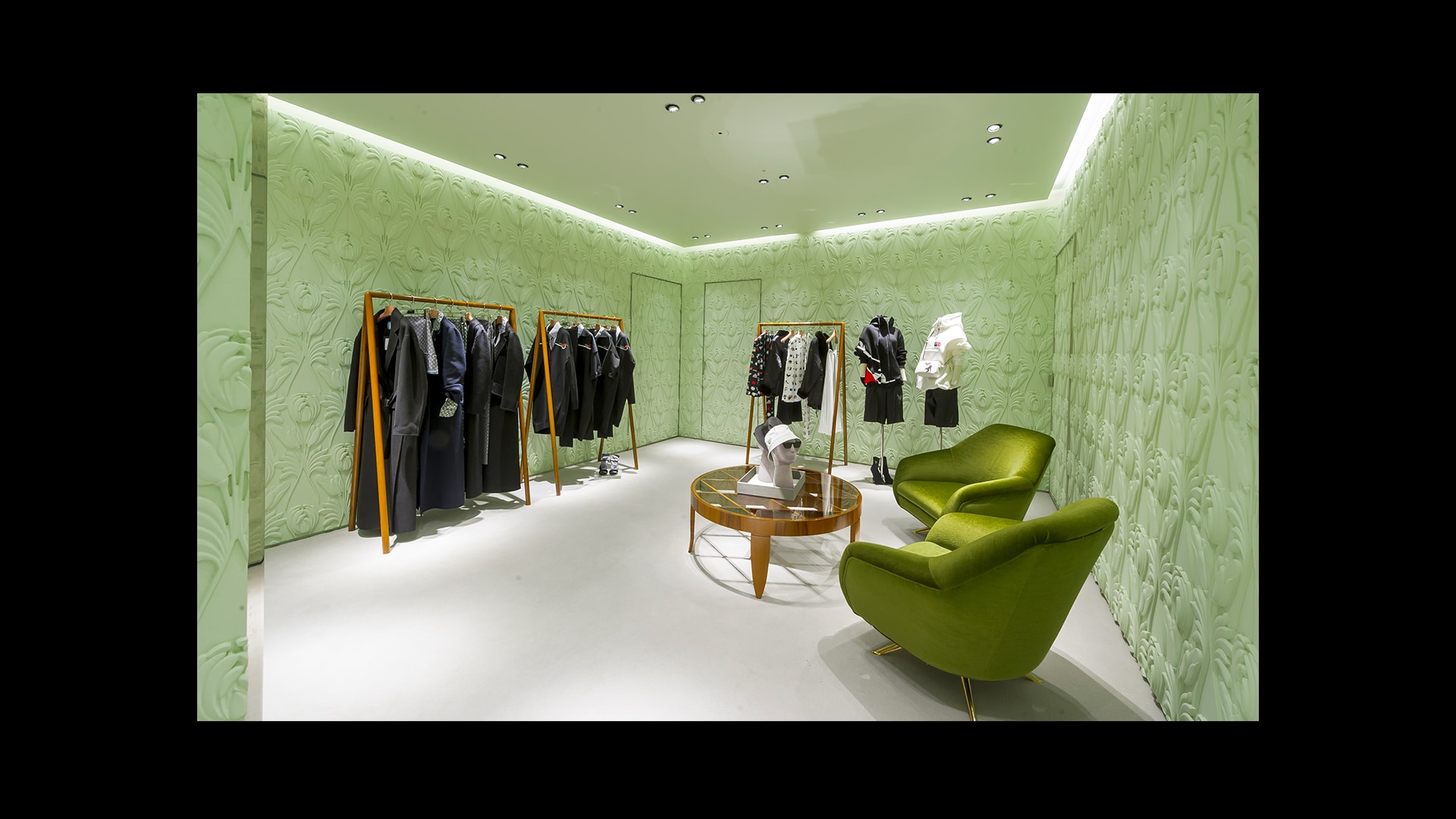 专为Miu Miu品牌打造的标志性锦缎面料,是其品牌特色贯穿全球的独特表达。天花板和地板采用同样的浅蓝色调,具有单色盒子的视觉效果,营造出亲密而时尚的氛围。