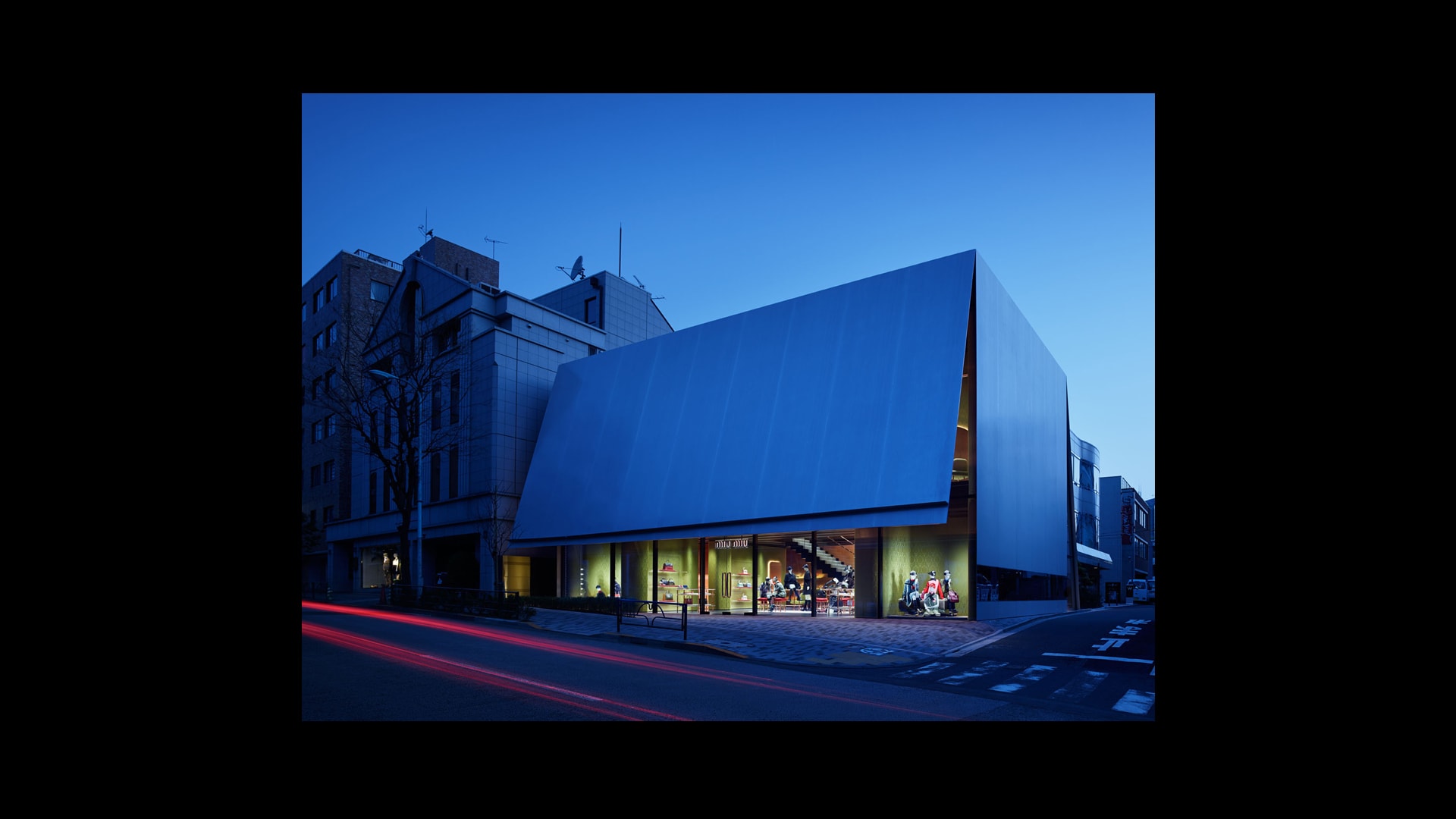 Miu Miu东京南青山概念店由Herzog & de Meuron建筑事务所设计,独特的建筑结构宛如一个微微开启的盒子,吸引着顾客一探究竟。该店于2015年开幕,座落于东京的中心地带,凭借独特的外观设计脱颖而出。建筑外墙采用光滑表面:与一般的商店橱窗不同,路人无法看到店内景象,却只能看到自己的身影。