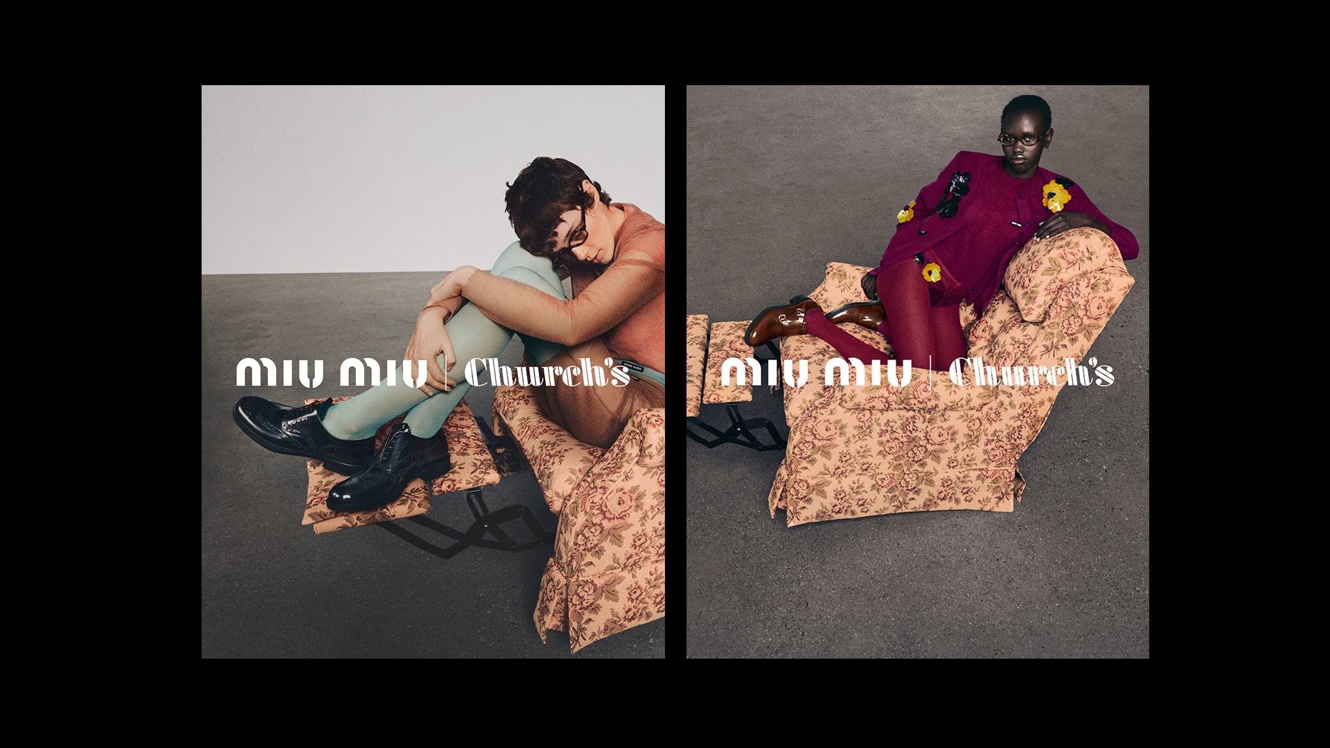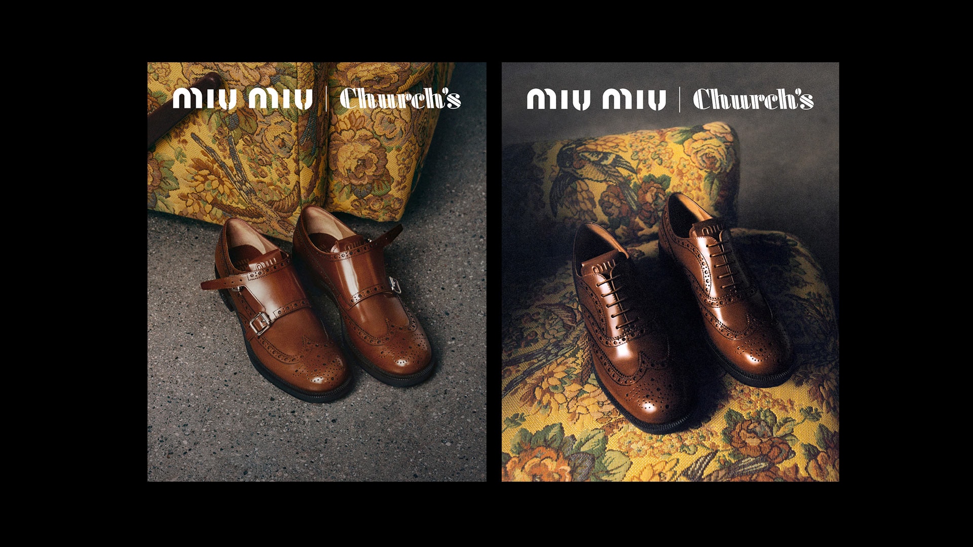 Church’s X Miu Miu胶囊系列包括布洛克和双搭扣孟克鞋,庆祝图像以Miu Miu经典面料装饰的华丽绅士扶手椅作为舞台。