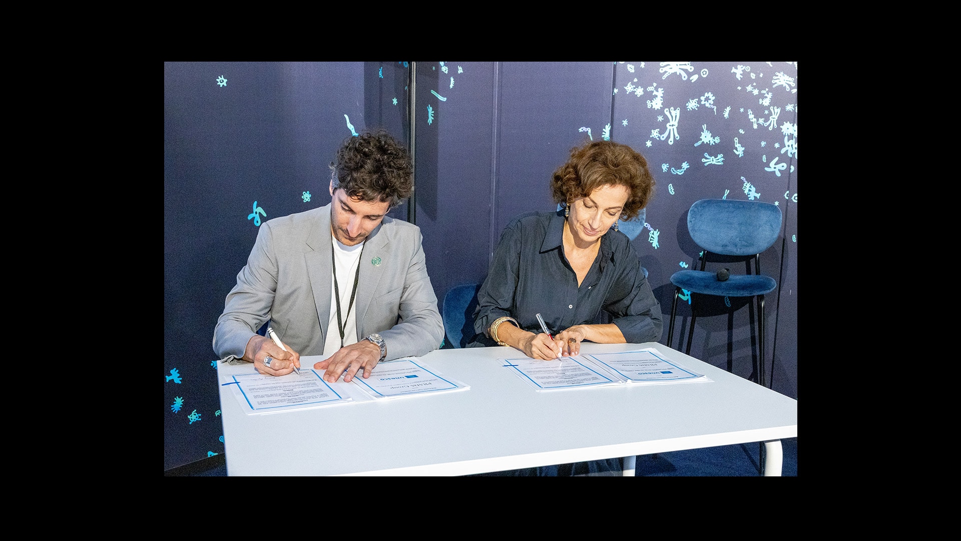 在尼斯Palexpo会展中心La Baleine,教科文组织总干事Audrey Azoulay与Prada集团企业社会责任负责人兼执行董事、“海洋十年”联盟赞助人Lorenzo Bertelli在联合国教科文组织展馆“超越边界:海洋未来”(Beyond Borders: Ocean Futures),共同签署了协议。