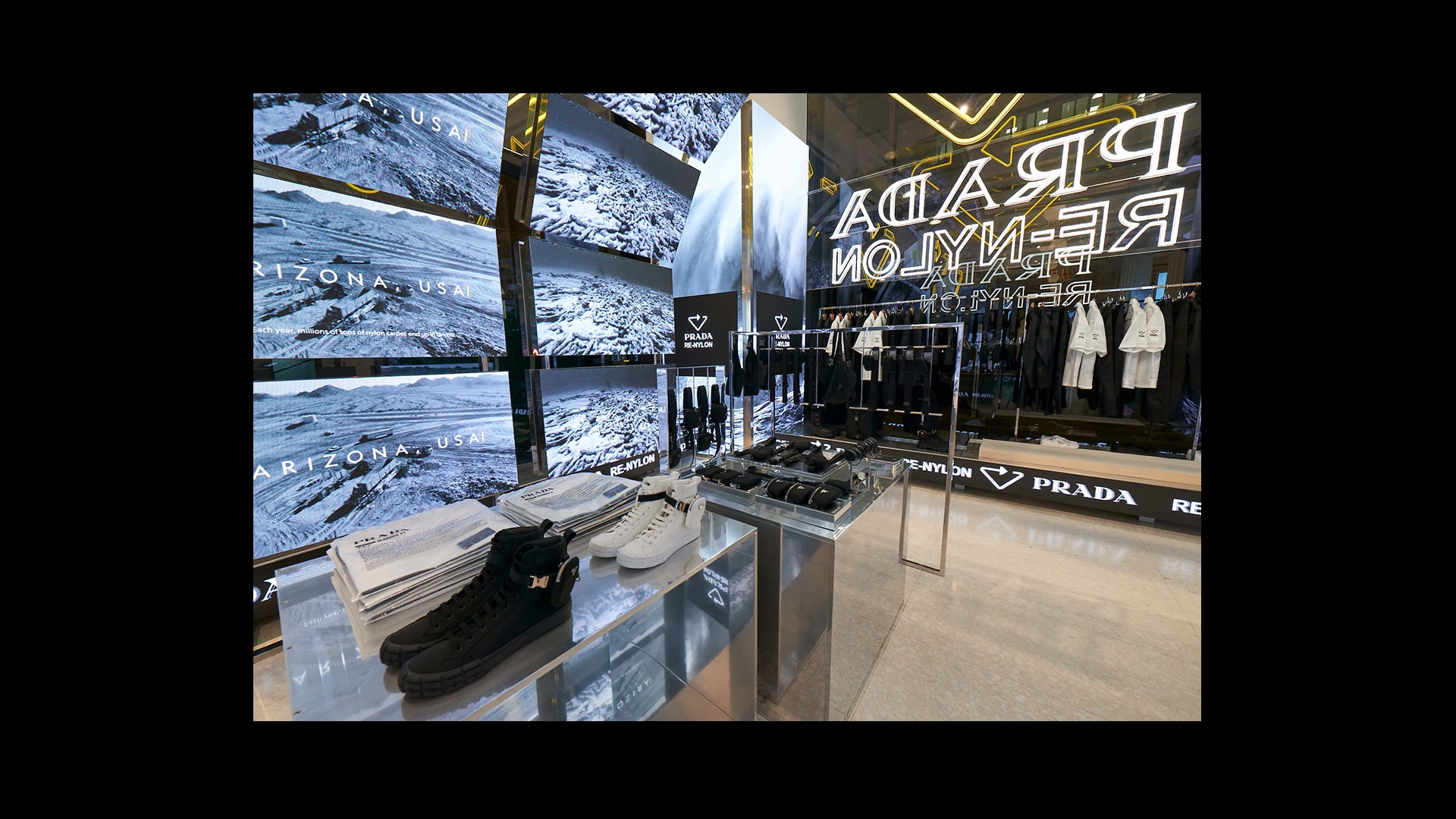 2020年8月25日,米兰——Selfridges发布可持续发展项目“Project Earth”,并于Corner Shop展示全新Prada再生尼龙系列。Prada再生尼龙系列Corner Shop为您带来身临其境的超酷体验。店内的展示配备多屏幕大型拱廊,同步放映由《国家地理》制作的特别短片。短片的画面以全黑白呈现:背景没有任何其他色彩,让人想起现代Prada尼龙系列核心精神的根源。