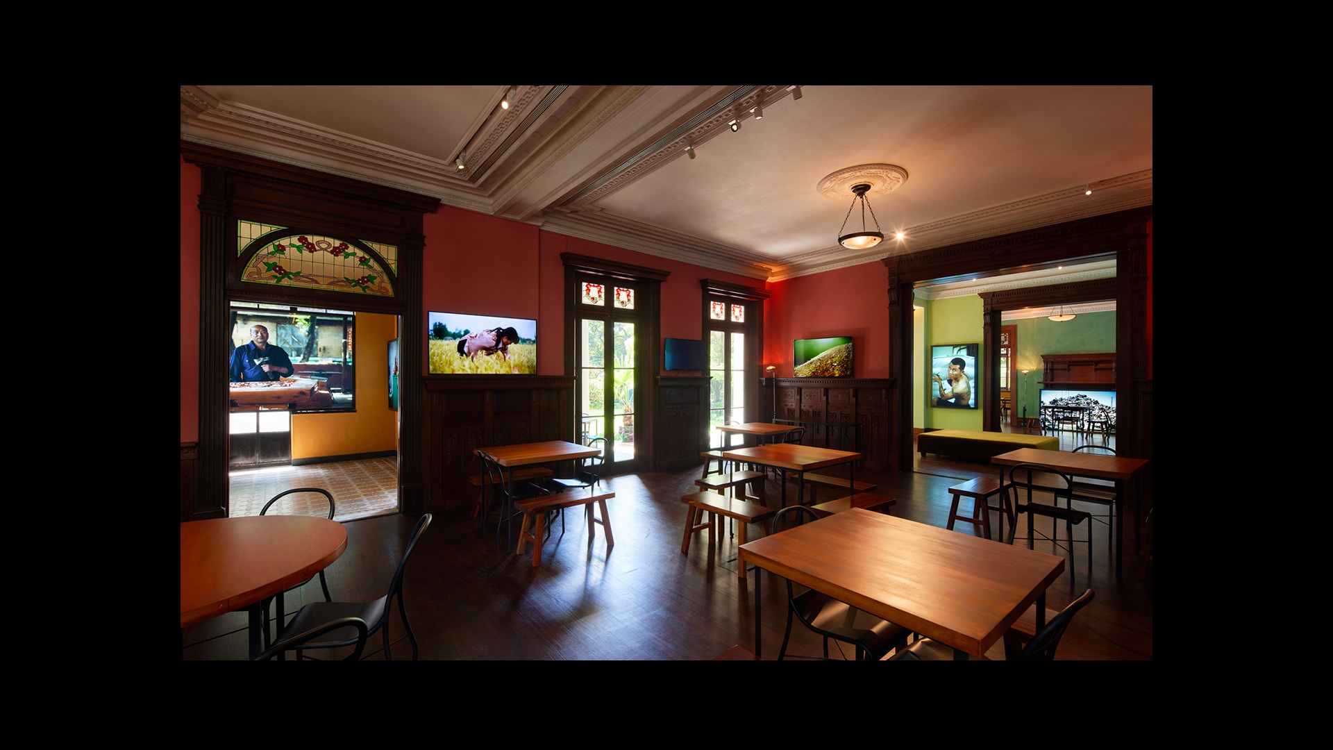 会员可以在80年代风格的录像厅中免费观看每日播放的电影,包括一系列贾樟柯导演的短片,还可享用精致美食和鸡尾酒,其灵感源自荣宅历史和贾樟柯导演在山西开设的“山河故人”餐馆。派对音乐由知名演员黄觉策划,他将现场重塑为90年代中国迪斯科舞厅,每晚呈献DJ表演,更有一众会员劲歌热舞。