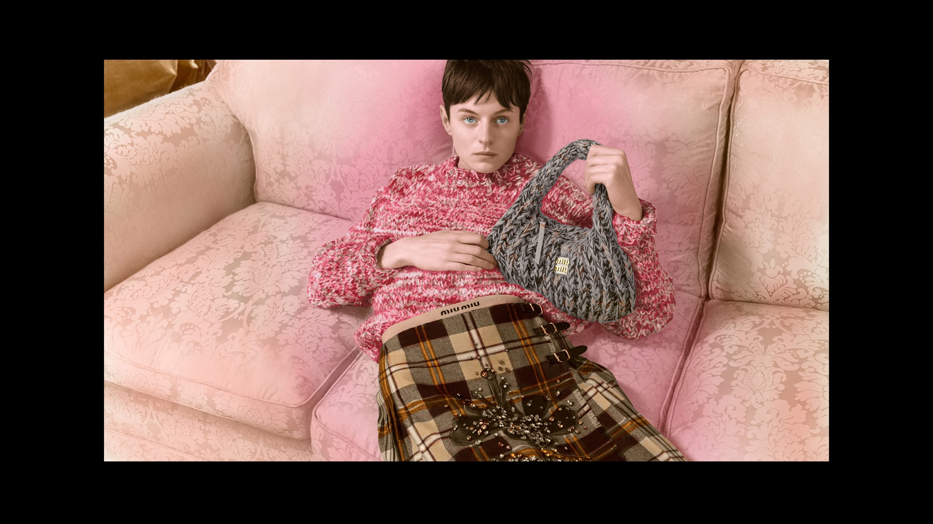 Upcycled皮革、Upcycled褶裙、Upcycled纱线、Upcyled刺绣:四种独特叙事均以旧材质为特色,经过工坊的精挑与加工,焕发新生活力。由Emma Corrin出镜的Miu Miu假日系列广告大片钜献此系列。Lengua镜头中的特殊色彩效果把服装带入空灵的怀旧氛围,如同复古假日明信片。
