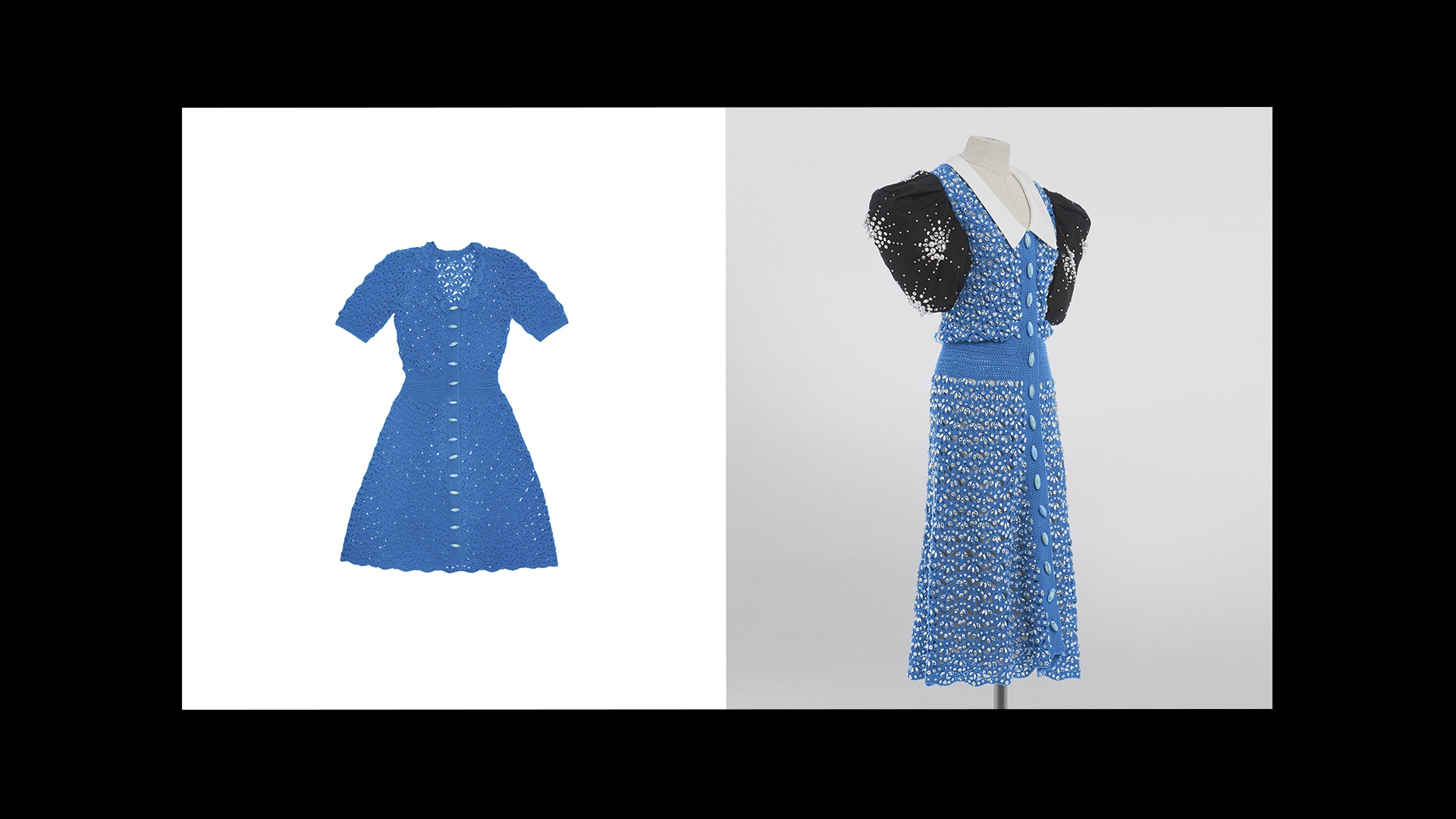 Blue wool crochet dress with original buttons customized with a rich all over crystal embroidery, white silk sablé collar and embroidered Victorian sleeves in black faille