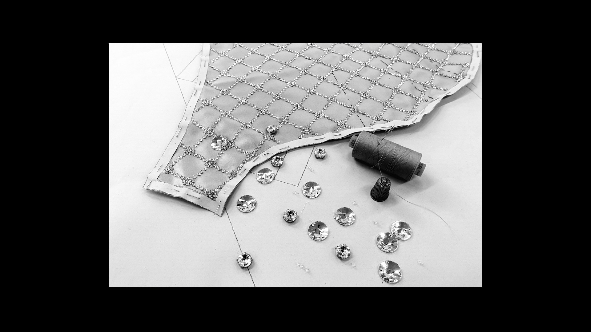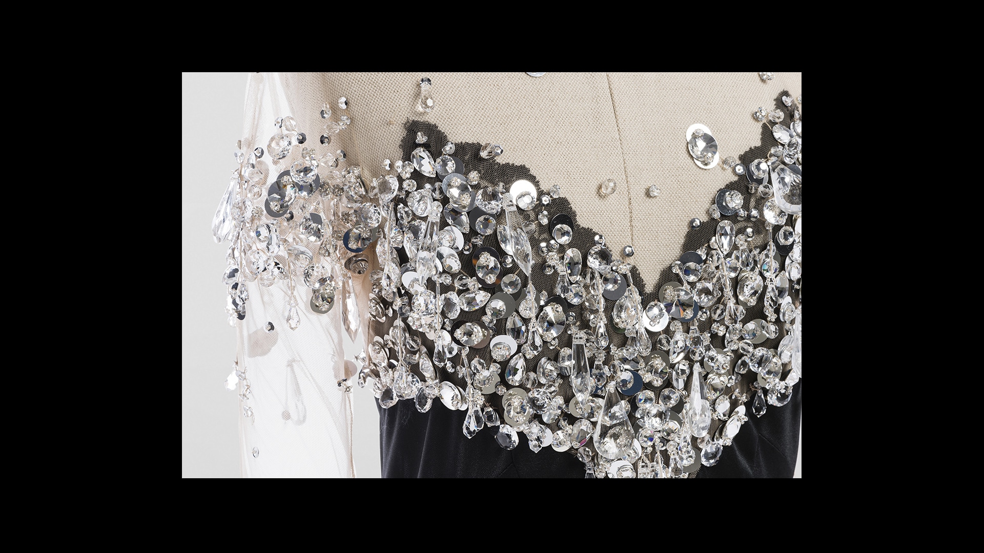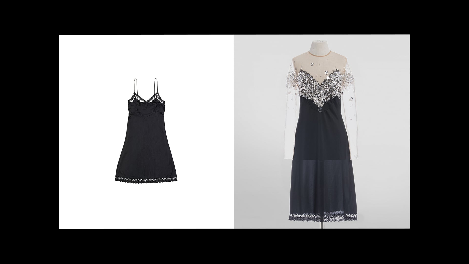 Black silk slip-dress customized with an invisible tulle sleeved bodice and crystal embroidery along the original dress neckline