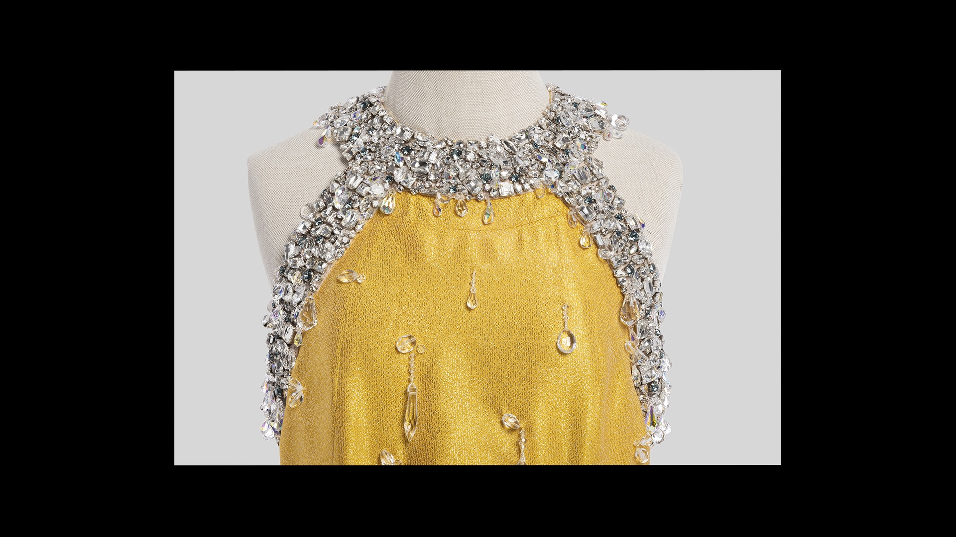 1960’s gold light jacquard cocktail dress customized with halter neck and rich crystal borders