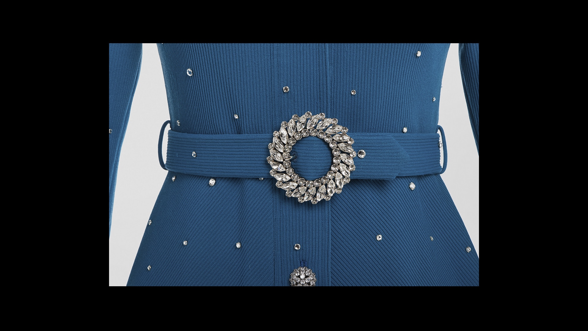 1970’s coat dress in ottoman blue customized with all over “diamanté” embellishment, jewelled buttons and buckle, and white lapel pointed collar