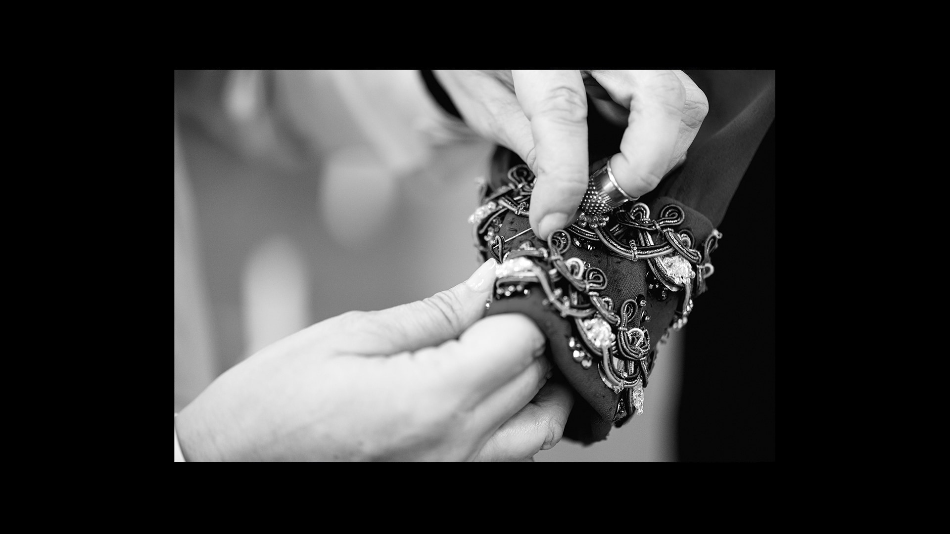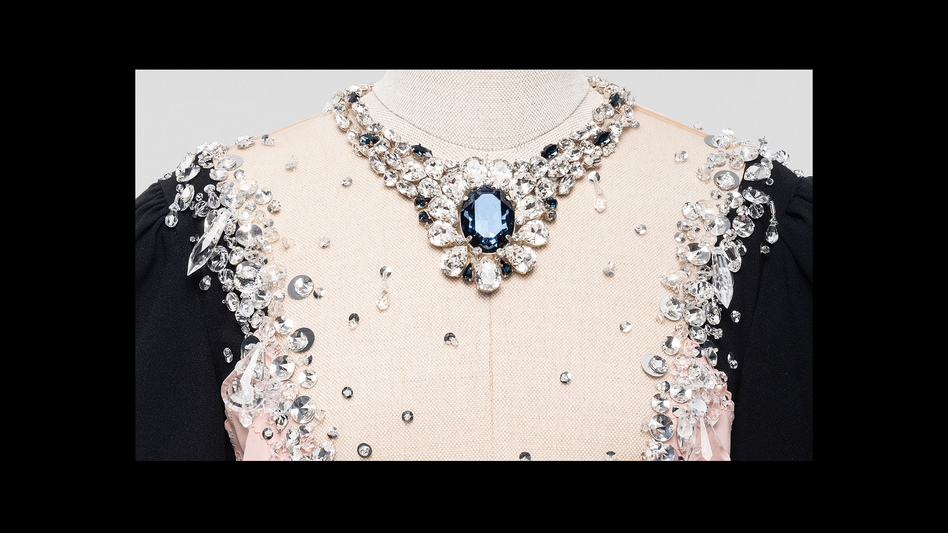 1970’s day dress customized with all over floral beads embroidery, crystal embroidered paisley pattern on black faille sleeves and jeweled collar